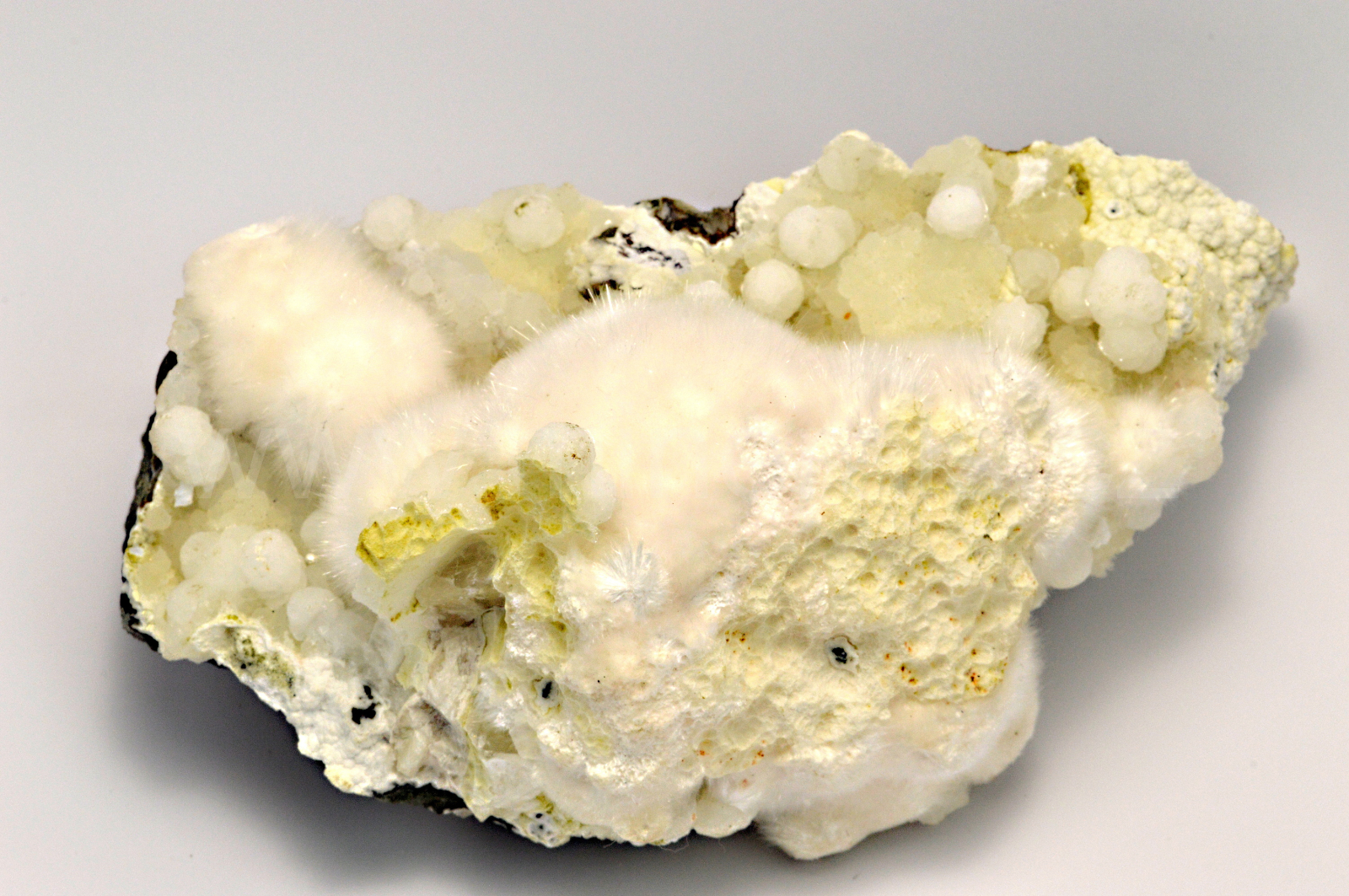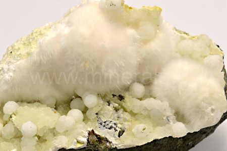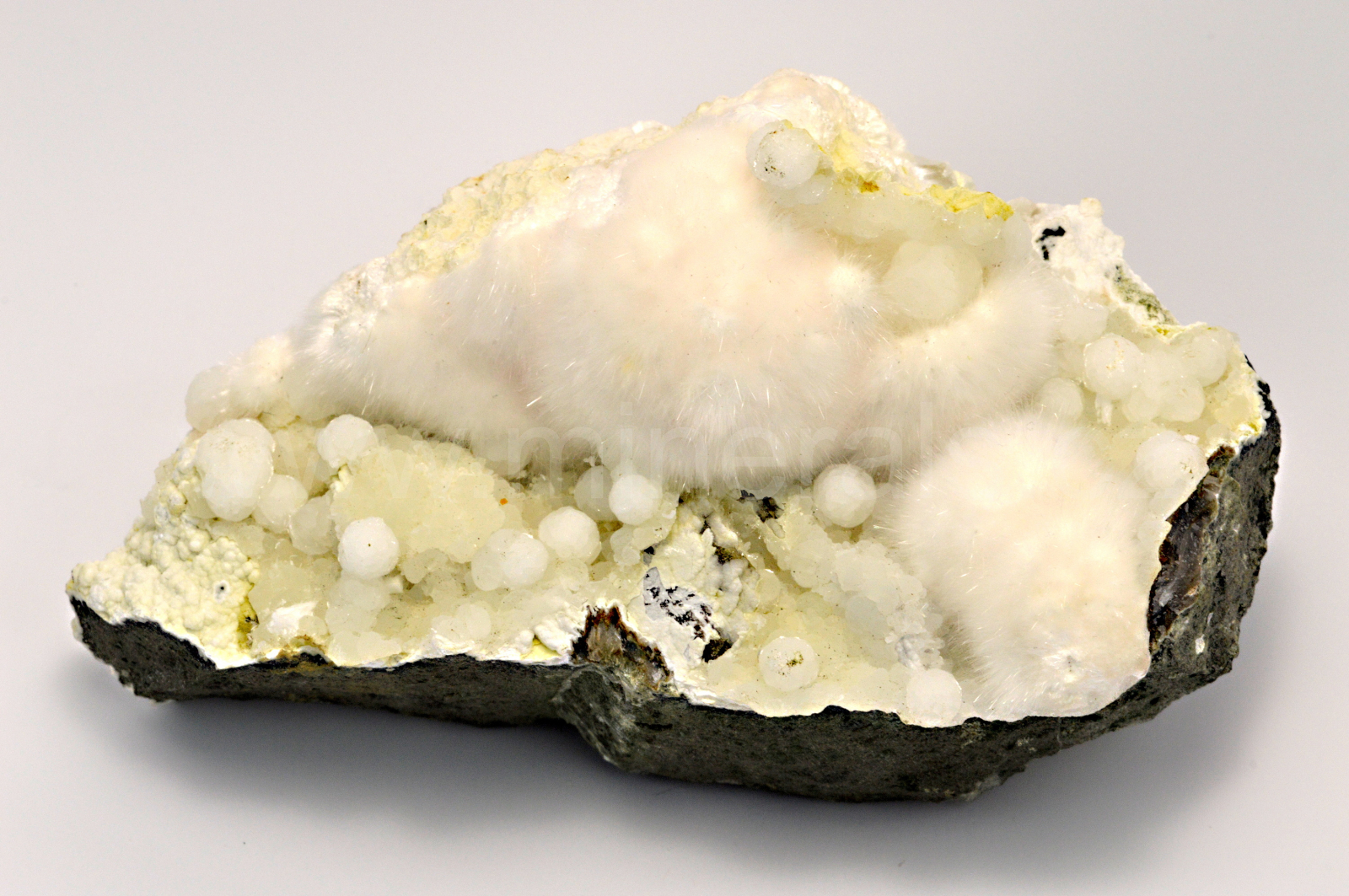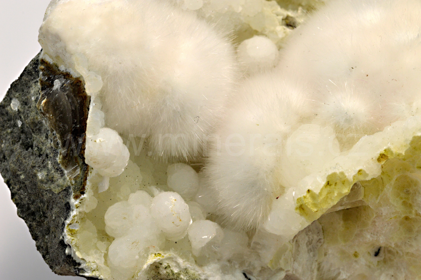 Okenit vytváří bezbarvé až mléčně bílé, hedvábně a perleťově lesklé, průsvitné, jehličkovité a vlasovité krystaly srůstající do kulovitých agregátů o velikosti až 30 mm, které se navzájem prorůstají. Okenit doprovází drobné, kulovité agregáty nazelenalého prehnitu a bílého gyrolitu. POZOR! Okenit se nesmí umývat pod vodou, protože by "zplihnul". Nemusíte se obávat, vzorek okenitu dokážeme odeslat v naprosto neporušeném stavu......