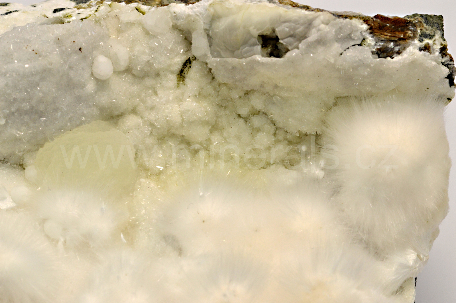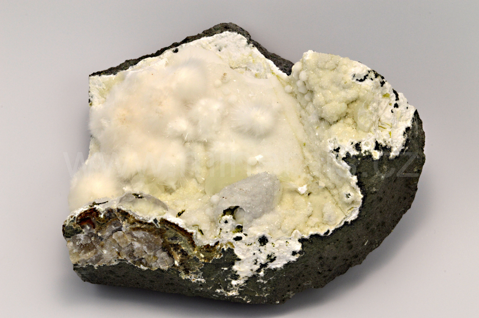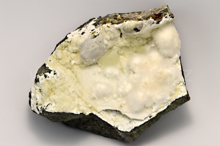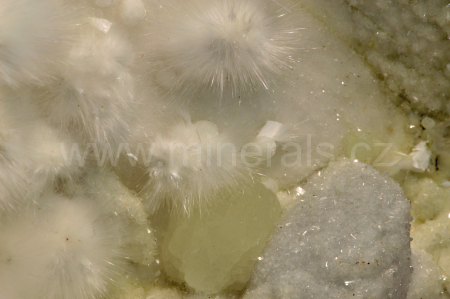 Okenit vytváří bezbarvé až mléčně bílé, hedvábně a perleťově lesklé, průsvitné, jehličkovité a vlasovité krystaly srůstající do kulovitých agregátů o velikosti až 25 mm, které se navzájem prorůstají. Okenit doprovází drobné, kulovité agregáty nazelenalého prehnitu, bílého gyrolitu, mléčně bílého laumontitu a drobné krystalů křišťálu. POZOR! Okenit se nesmí umývat pod vodou, protože by "zplihnul". Nemusíte se obávat, vzorek okenitu dokážeme odeslat v naprosto neporušeném stavu......