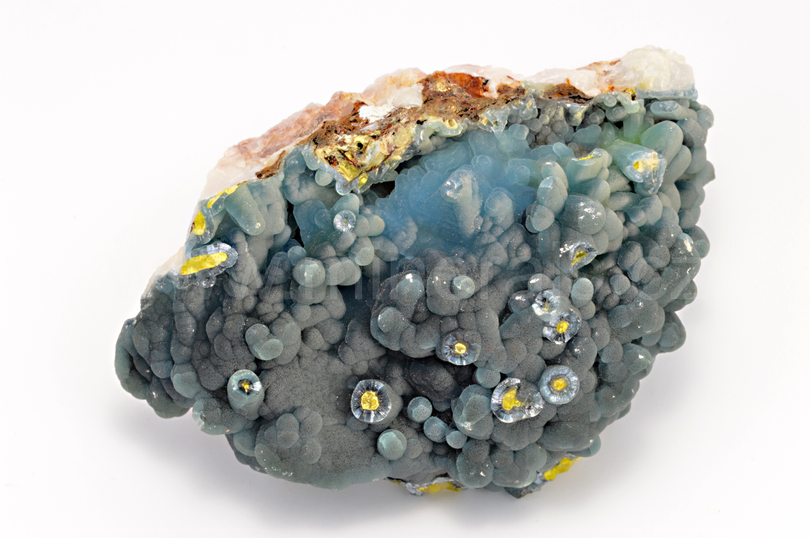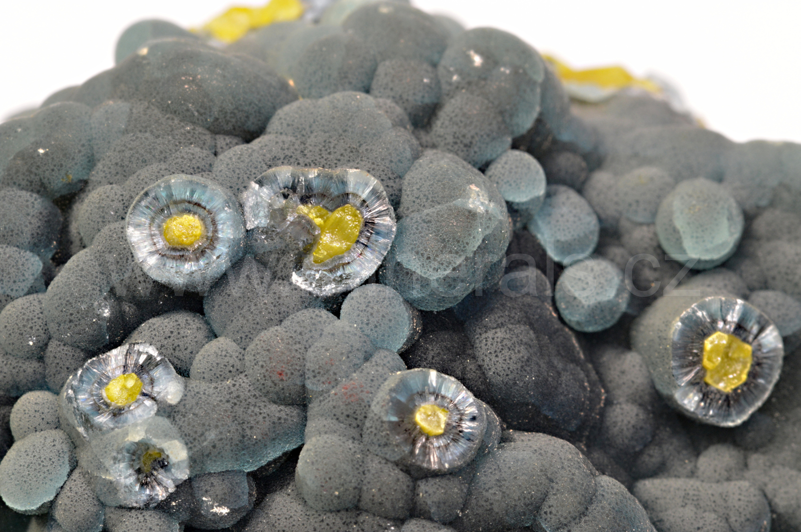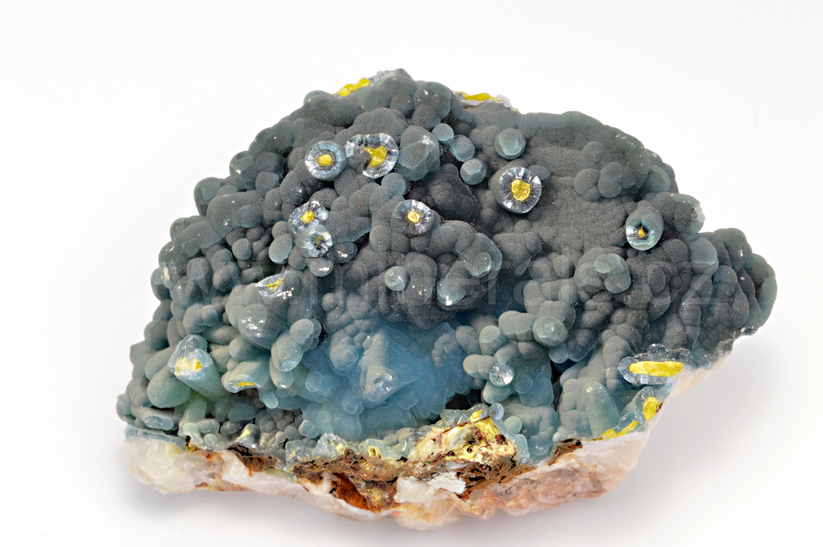Plumbogummit vytváří tmavě modré, skelně až hedvábně lesklé, částečně průsvitné ledvinité agregáty a kůry, které pokrývají sytě žluté, skelně lesklé, protažené krystaly pyromorfitu. Vzorek je ve spodní části formátovaný podříznutím. Kvalitní vzorek.