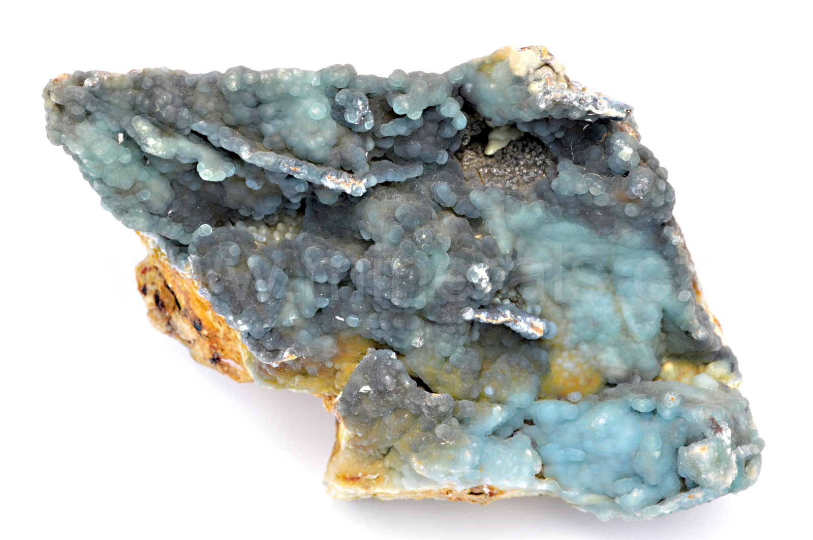 Plumbogummit vytváří světle a tmavě modré, skelně až hedvábně lesklé, částečně průsvitné ledvinité agregáty a kůry, které pokrývají křemennou podložku. Vzorek je ve spodní části formátovaný podříznutím. Kvalitní vzorek.