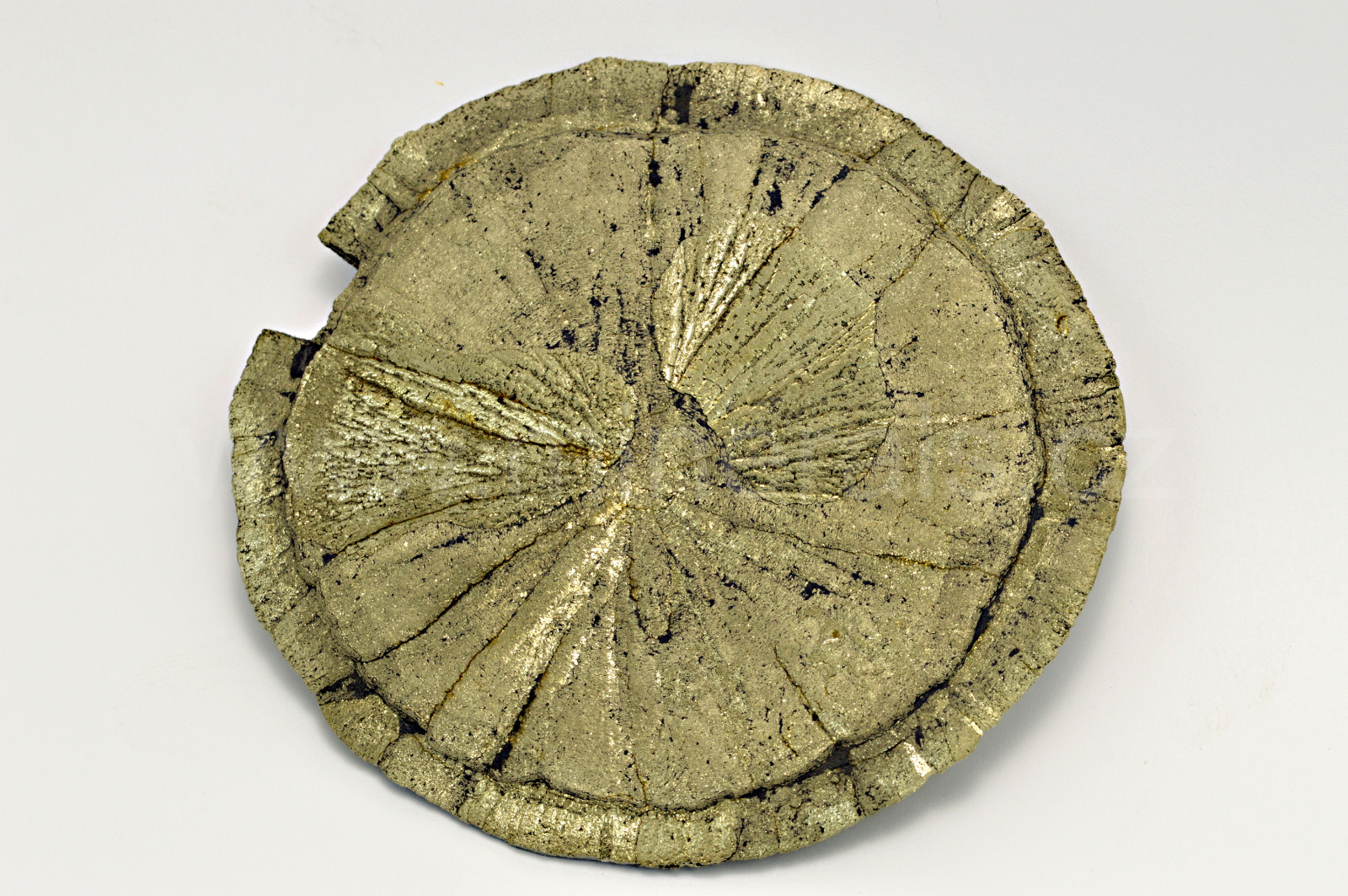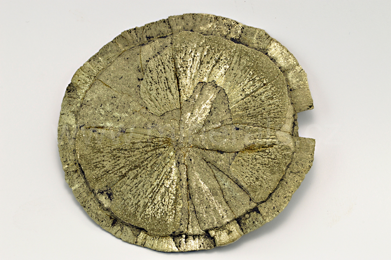 Pyrit (v této formě nazývaný pyritové slunce nebo pyritový dolar) vytváří temně zlatavě žlutý, kovově lesklý, neprůsvitný, plochý, radiálně paprsčitý agregát. Oboustranný vzorek. Mineralogická zvláštnost.