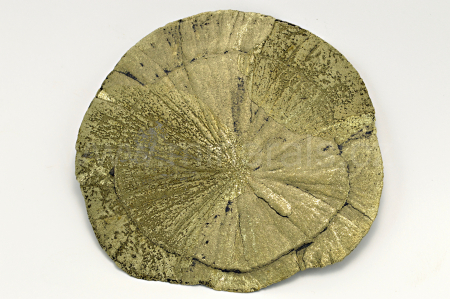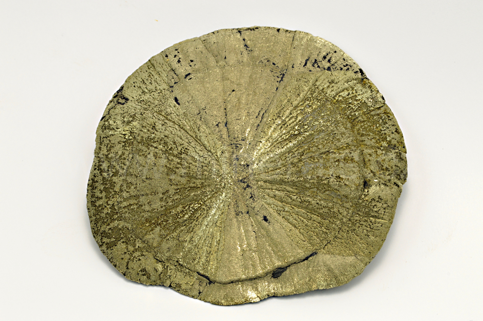 Pyrit (v této formě nazývaný pyritové slunce nebo pyritový dolar) vytváří temně zlatavě žlutý, kovově lesklý, neprůsvitný, plochý, radiálně paprsčitý agregát. Oboustranný vzorek. Mineralogická zvláštnost.