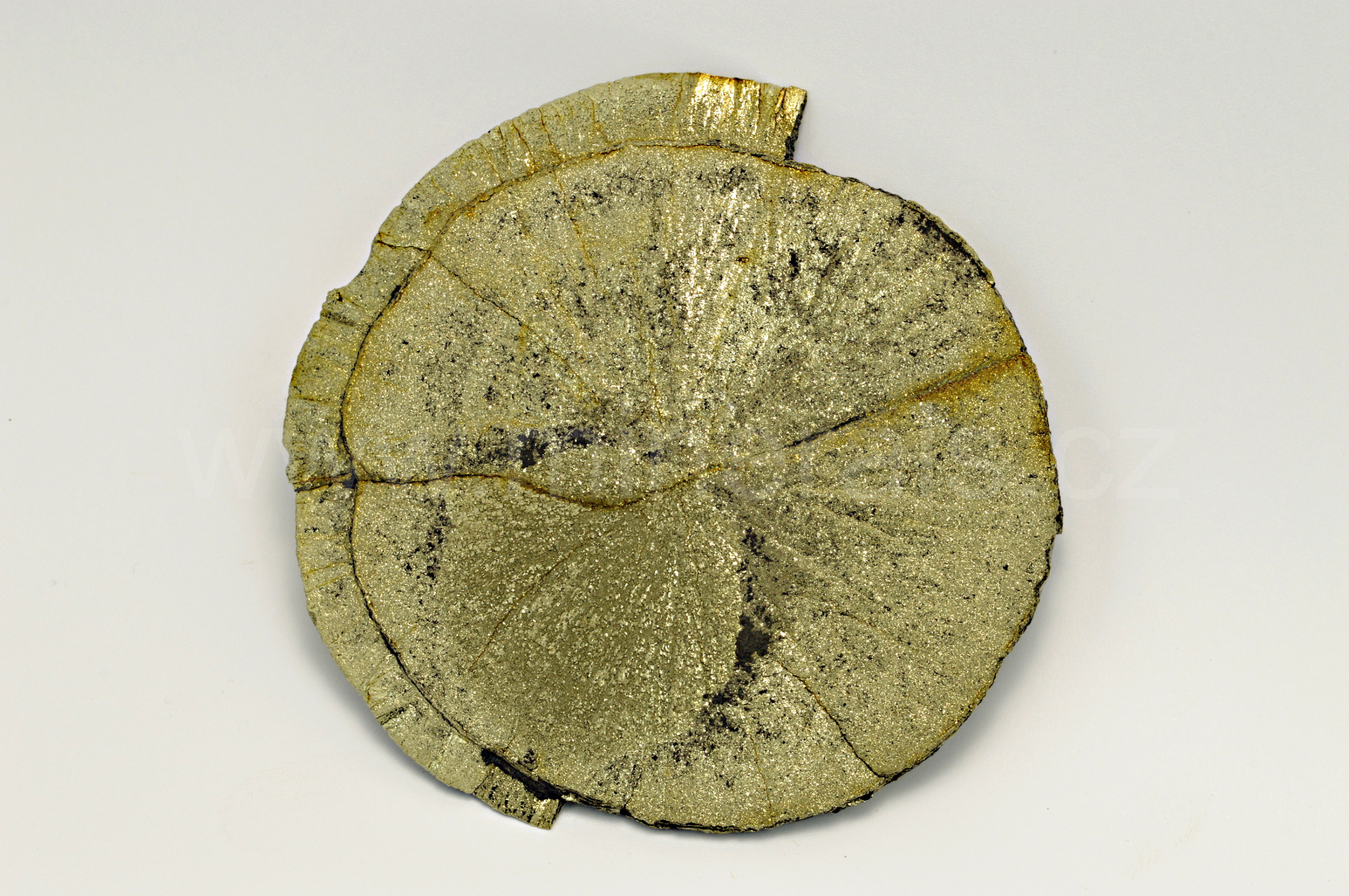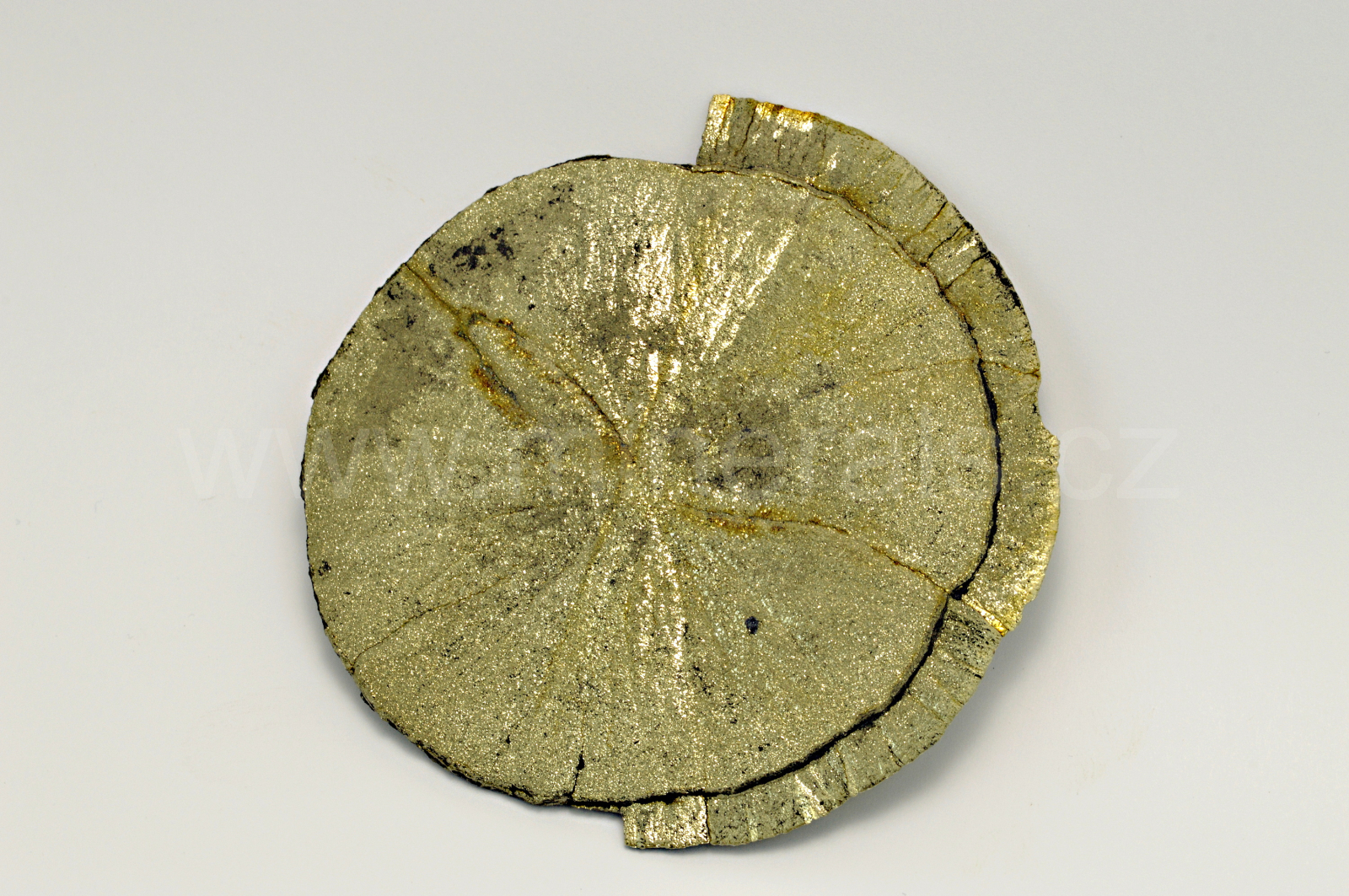 Pyrit (v této formě nazývaný pyritové slunce nebo pyritový dolar) vytváří temně zlatavě žlutý, kovově lesklý, neprůsvitný, plochý, radiálně paprsčitý agregát. Oboustranný vzorek. Mineralogická zvláštnost.