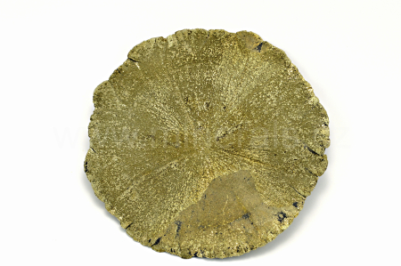 Pyrit (v této formě nazývaný pyritové slunce nebo pyritový dolar) vytváří temně zlatavě žlutý, kovově lesklý, neprůsvitný, plochý, radiálně paprsčitý agregát. Oboustranný vzorek. Mineralogická zvláštnost.