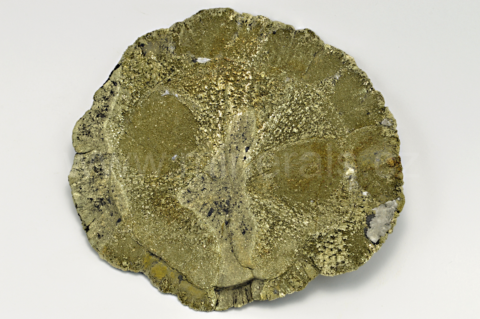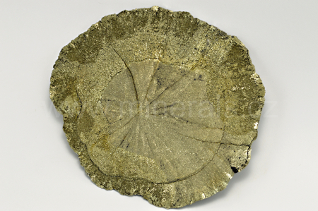 Pyrit (v této formě nazývaný pyritové slunce nebo pyritový dolar) vytváří temně zlatavě žlutý, kovově lesklý, neprůsvitný, plochý, radiálně paprsčitý agregát. Oboustranný vzorek. Mineralogická zvláštnost.