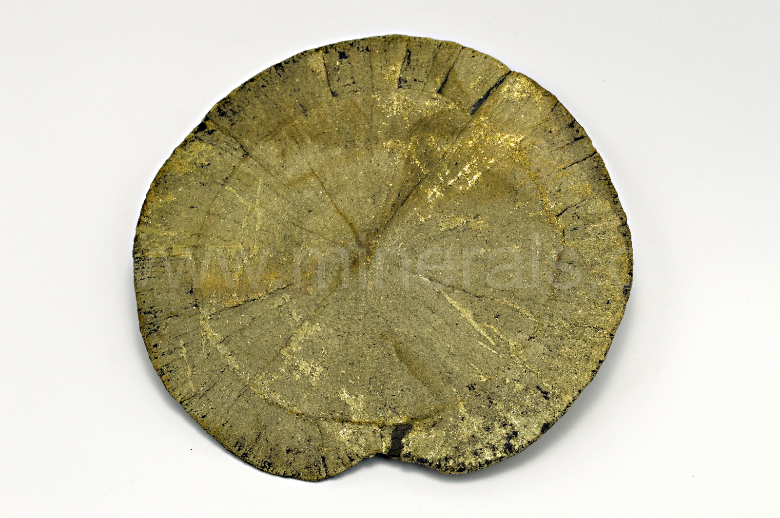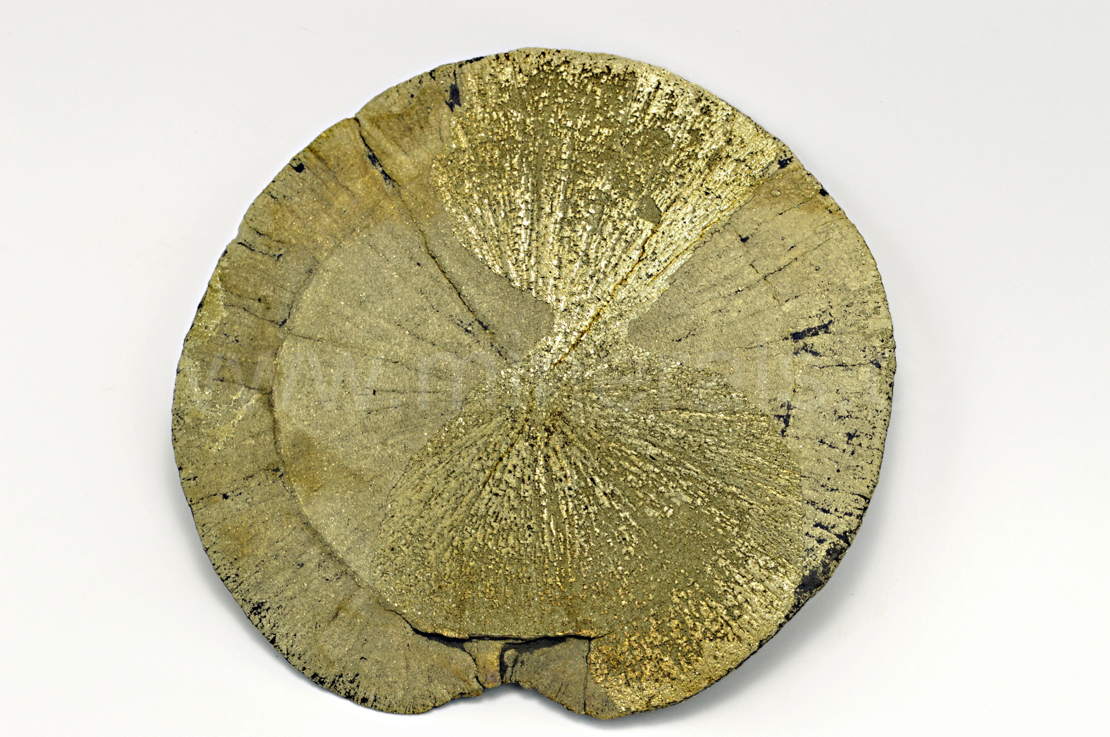 Pyrit (v této formě nazývaný pyritové slunce nebo pyritový dolar) vytváří temně zlatavě žlutý, kovově lesklý, neprůsvitný, plochý, radiálně paprsčitý agregát. Oboustranný vzorek. Mineralogická zvláštnost.