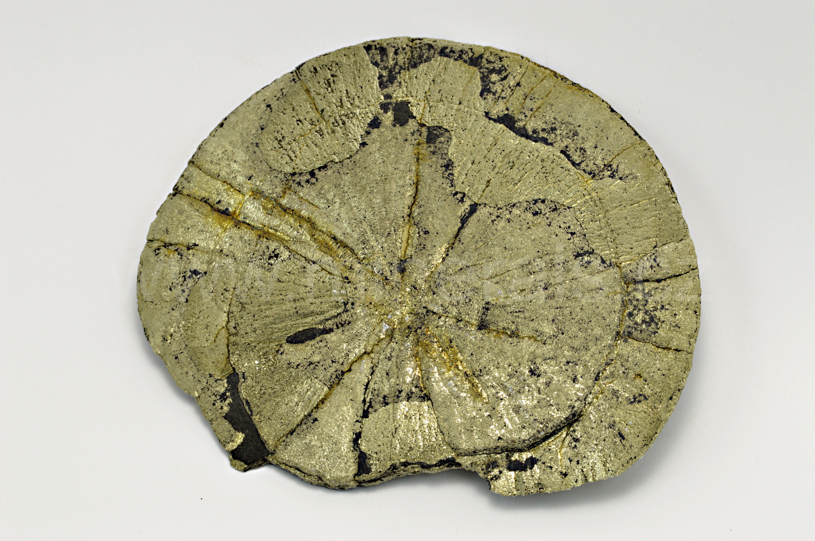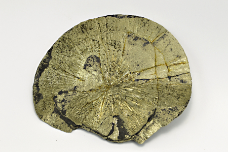 Pyrit (v této formě nazývaný pyritové slunce nebo pyritový dolar) vytváří temně zlatavě žlutý, kovově lesklý, neprůsvitný, plochý, radiálně paprsčitý agregát. Oboustranný vzorek. Mineralogická zvláštnost.