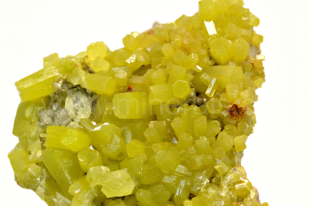 Pyromorfit vytváří žlutozelené, skelně až diamantově lesklé, částečně průsvitné, protažené soudkovité krystaly dosahující délky až 7 mm, které se navzájem prorůstají a pokrývají skoro celou plochu vzorku.