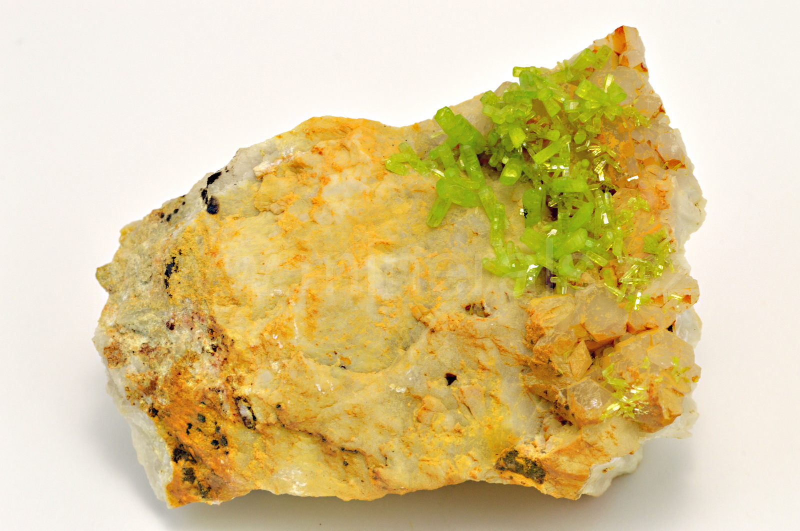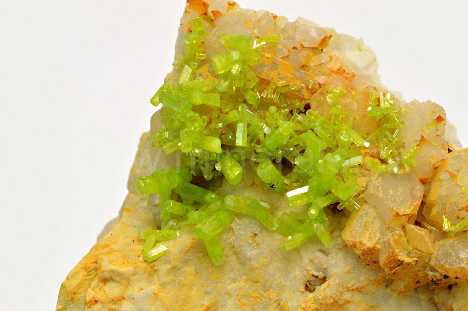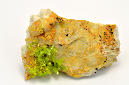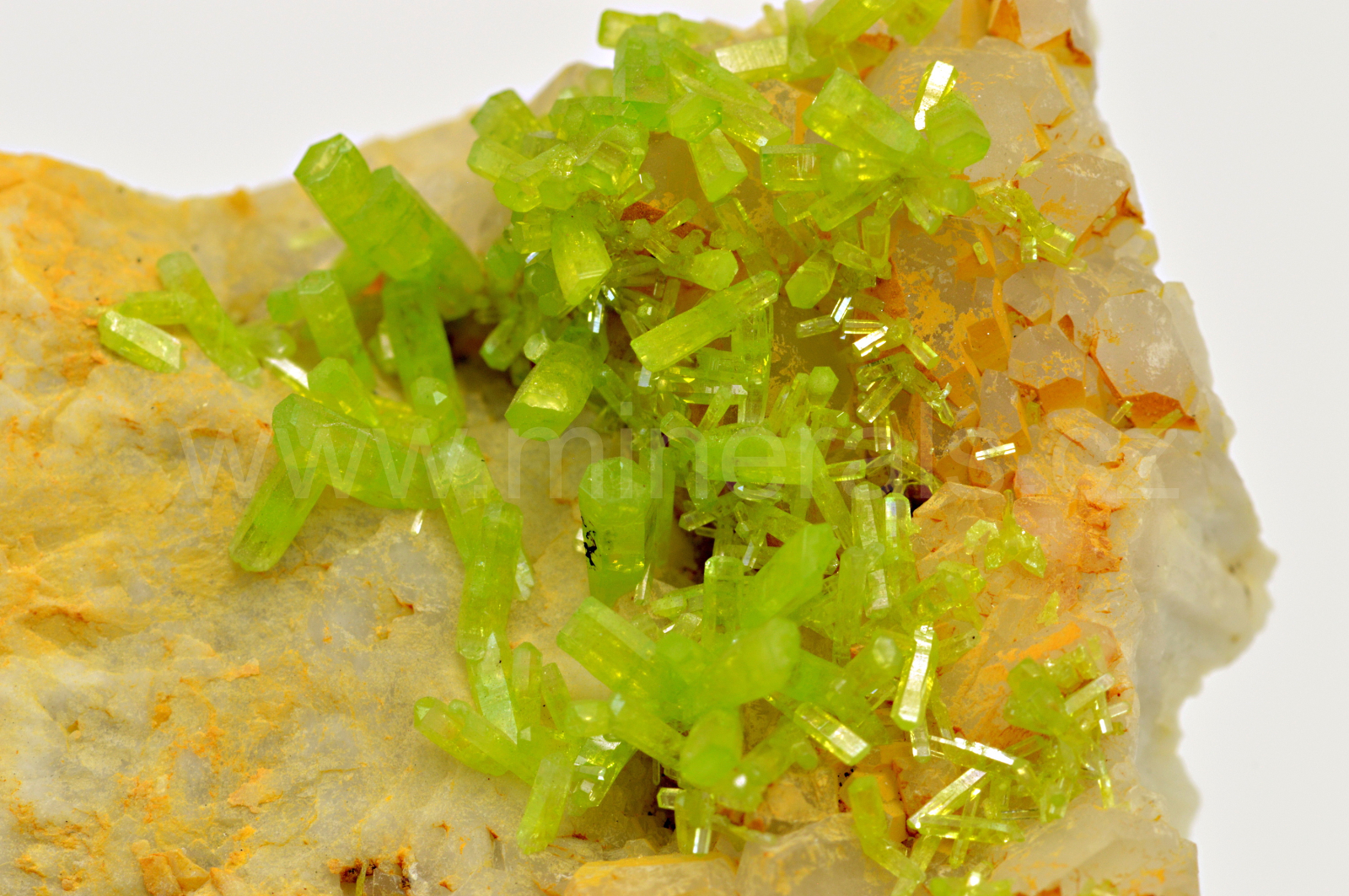 Pyromorfit vytváří žlutozelené, skelně až diamantově lesklé, částečně průsvitné, protažené soudkovité krystaly dosahující délky až 7 mm, které se navzájem prorůstají. Krystaly pyromorfitu mají na tomto vzorku extrémní lesk.