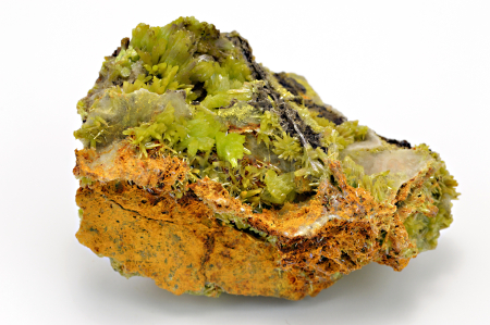 Pyromorfit vytváří nahnědlé, světle a tmavě zelené, skelně lesklé, částečně průsvitné, protažené soudkovité krystaly dosahující délky až 9 mm, které se navzájem prorůstají a vyplňují nevelké dutiny po celém vzorku.