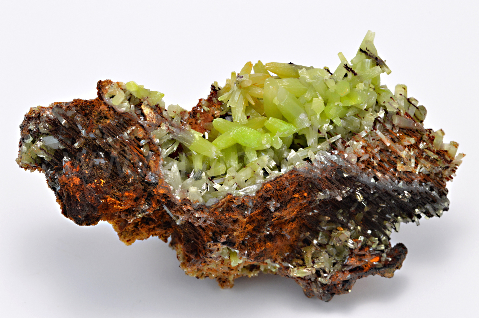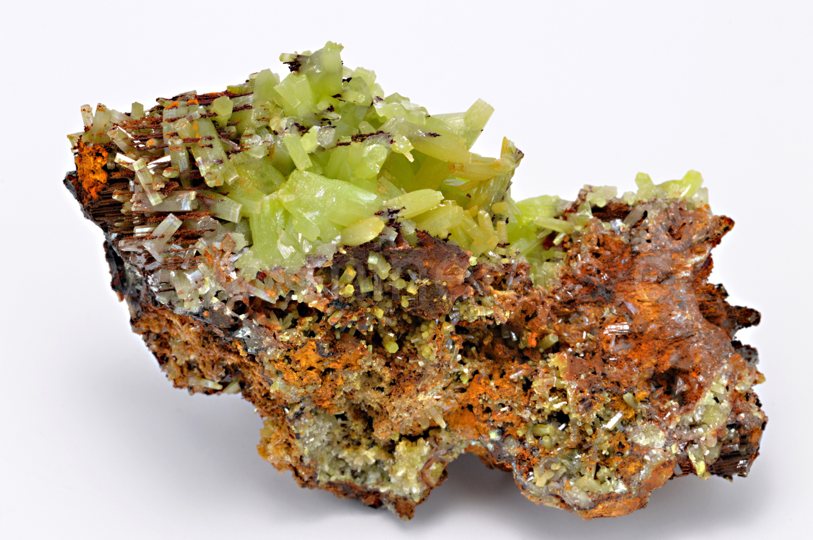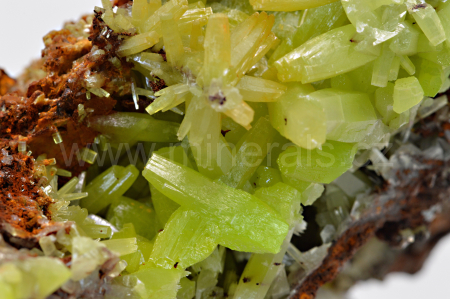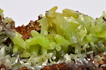 Pyromorfit vytváří světle a sytě zelené, skelně až diamantově lesklé, částečně průsvitné, protažené soudkovité krystaly dosahující délky až 13 mm, které se navzájem prorůstají. Podotýkám, že ne všechny krystaly jsou ukončené, vzorek by mněl mnohem vyšší cenu.