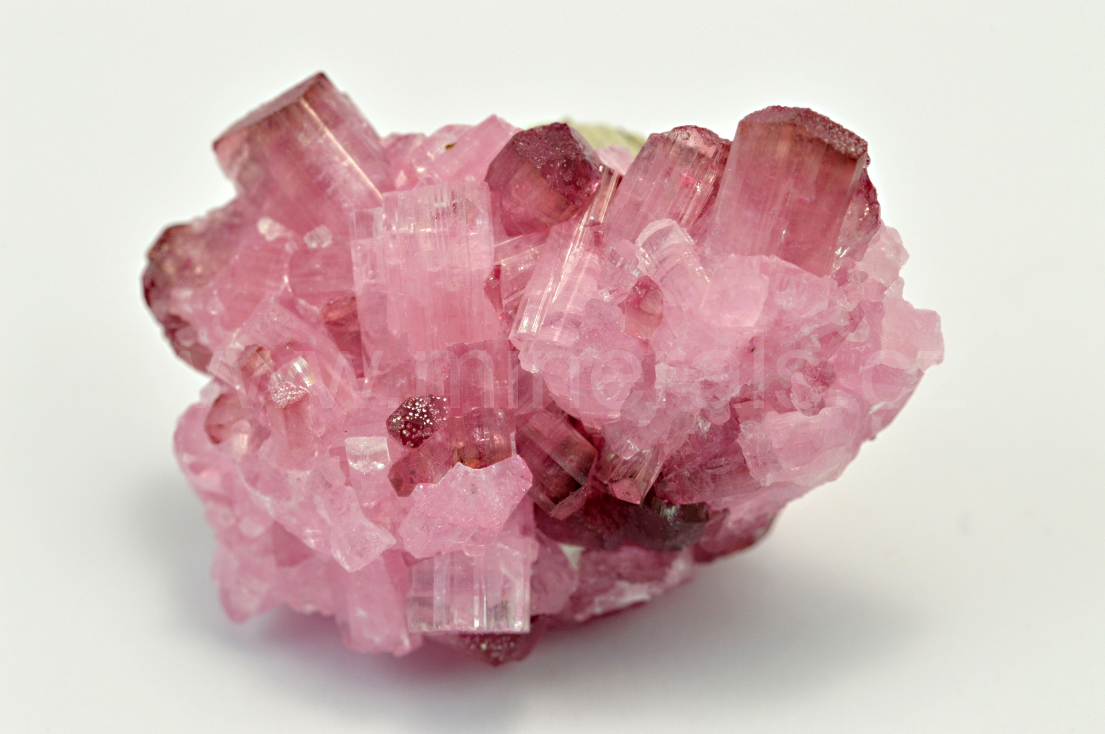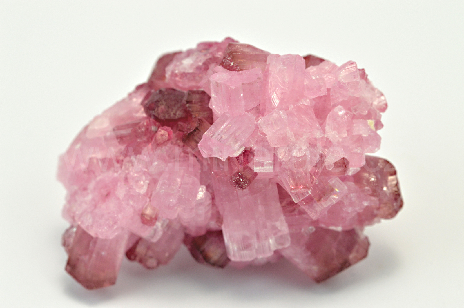Rubelit tvoří růžové, na koncích krystalů do malinově červena, skelně lesklé, průsvitné, podélně rýhované, sloupcovité, většinou oboustranně ukončené krystaly dosahující velikosti až 10 mm, které se navzájem prorůstají a tvoří celý vzorek. Vzorky pocházejí z dubnové akce 2017.