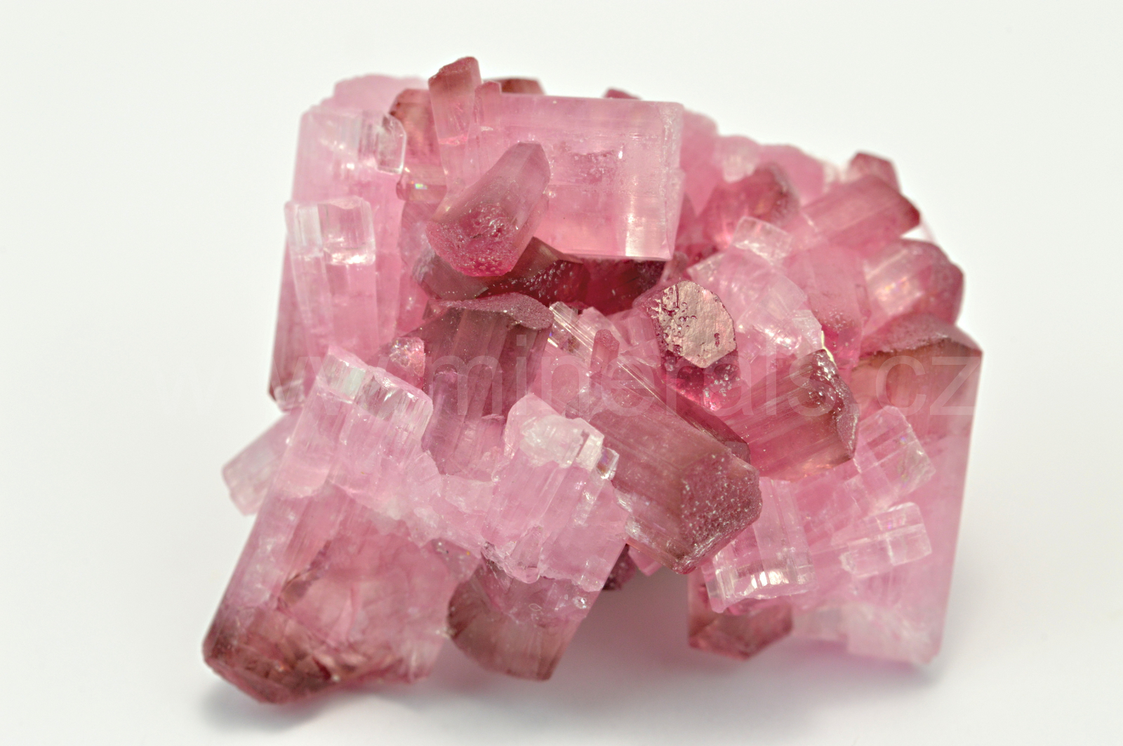 Rubelit vytváří růžové, na koncích krystalů do malinově červena, skelně lesklé, průsvitné, podélně rýhované, sloupcovité, většinou oboustranně ukončené krystaly dosahující velikosti až 11 mm, které se navzájem prorůstají a tvoří celý oboustranný vzorek. Vzorky pocházejí z dubnové akce 2017.