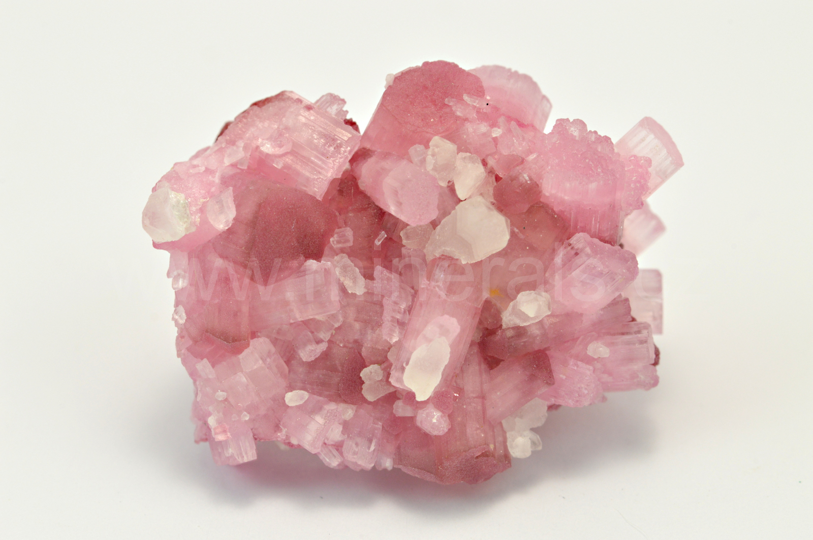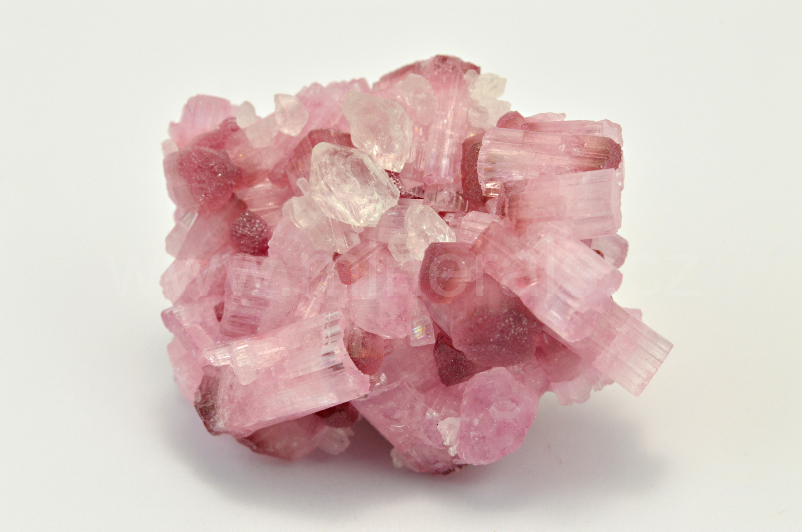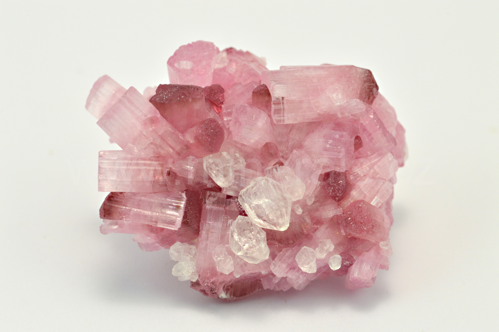 Rubelit vytváří růžové, na koncích krystalů do malinově červena, skelně lesklé, průsvitné, podélně rýhované, sloupcovité, většinou oboustranně ukončené krystaly dosahující velikosti až 11 mm, které se navzájem prorůstají a na které narůstají drobné krystaly křišťálu. Vzorky pocházejí z dubnové akce 2017.