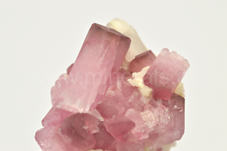 Rubelit vytváří růžové, na koncích krystalů do malinově červena, skelně lesklé, průsvitné, podélně rýhované, sloupcovité, většinou oboustranně ukončené krystaly dosahující velikosti až 13 mm, které se navzájem prorůstají a narůstají na drobnou živcovou podložku. Vzorky pocházejí z dubnové akce 2017.
