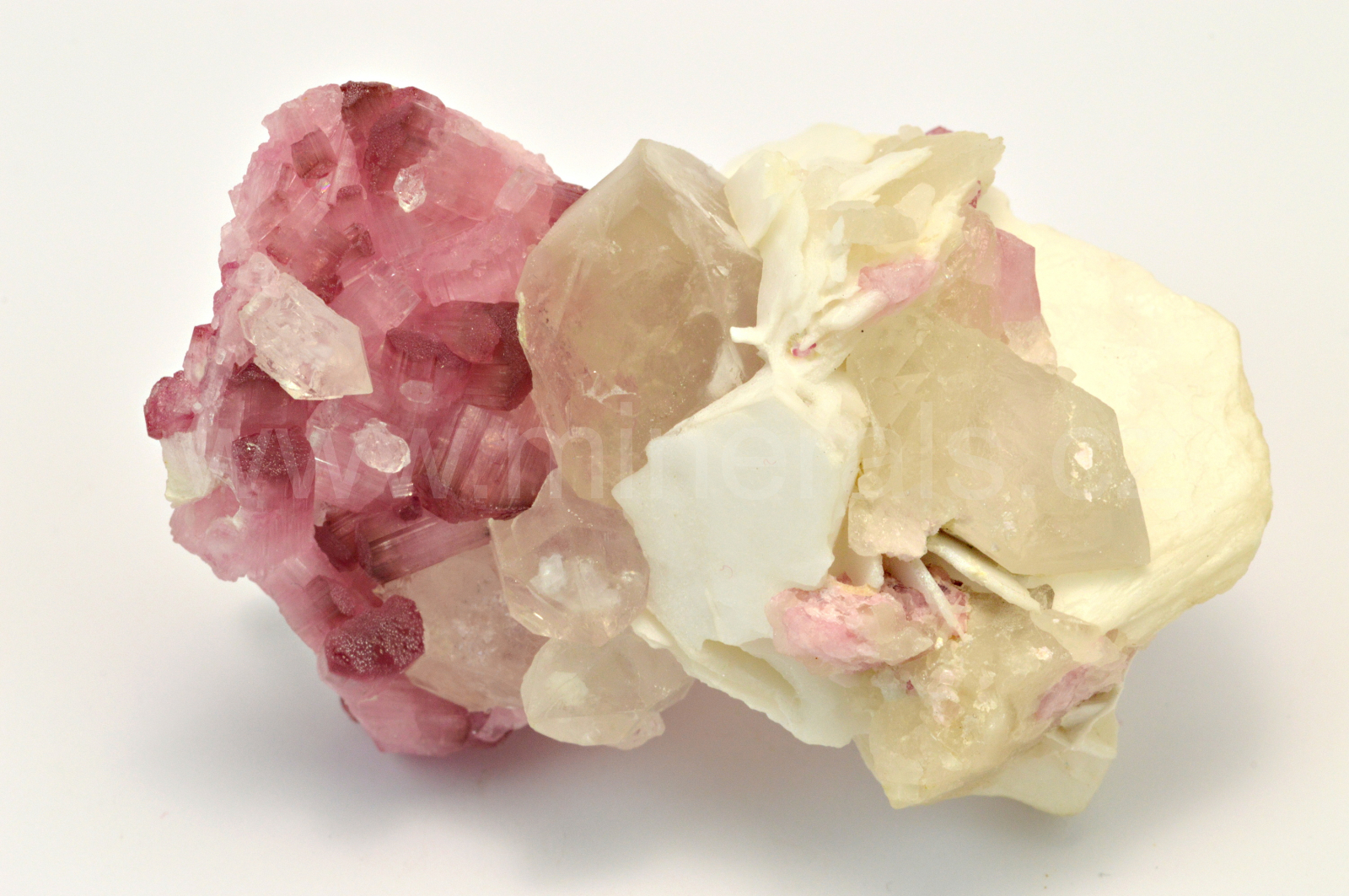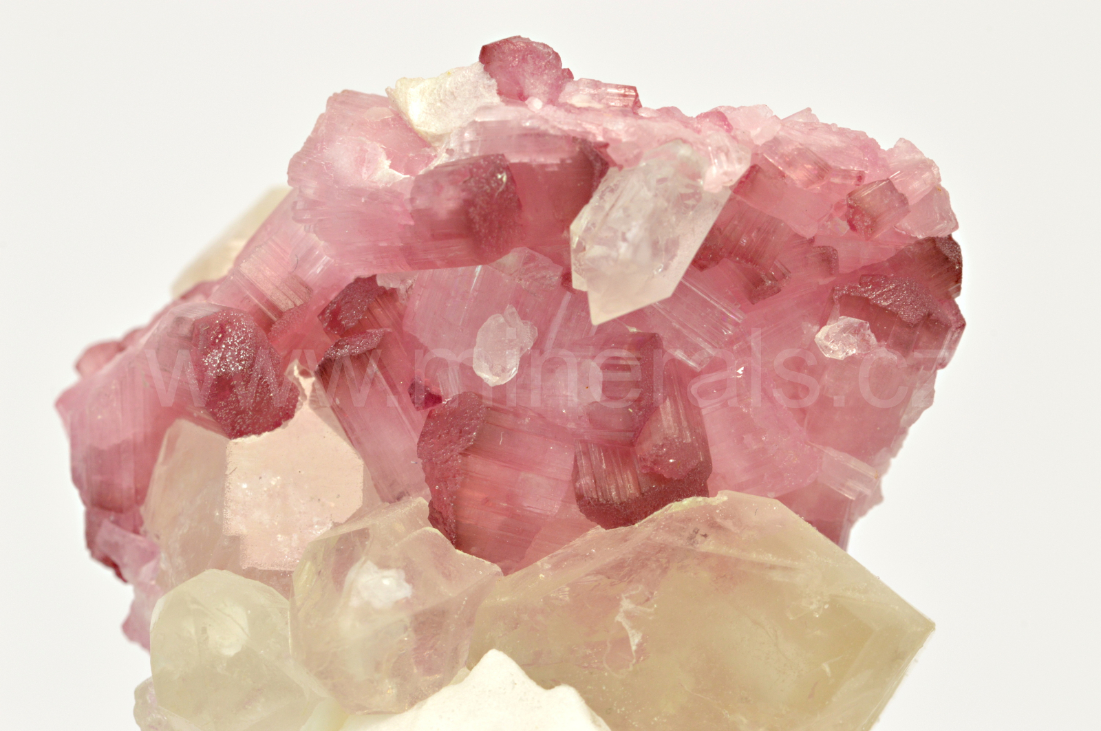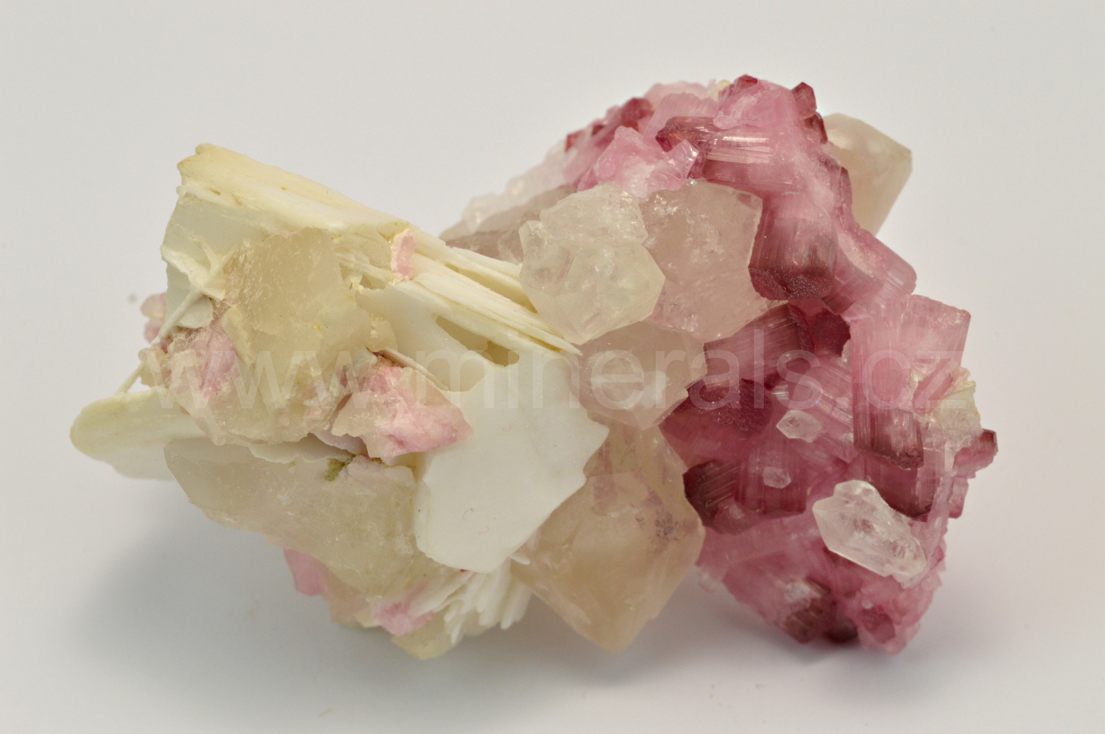 Rubelit vytváří růžové, na koncích krystalů do malinově červena, skelně lesklé, průsvitné, podélně rýhované, sloupcovité, většinou oboustranně ukončené krystaly dosahující velikosti až 11 mm, které se navzájem prorůstají a narůstají na srostlici křišťálu s mléčně bílými, tabulkovitými agregáty kalcitu. Vzorky pocházejí z dubnové akce 2017.