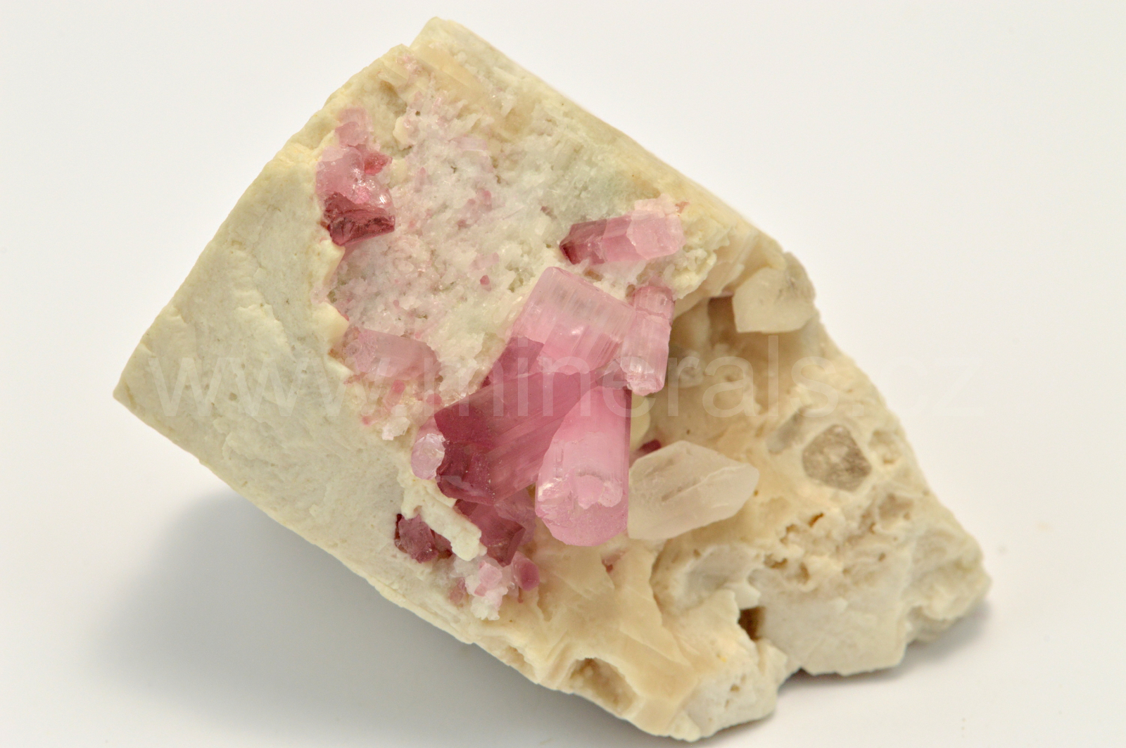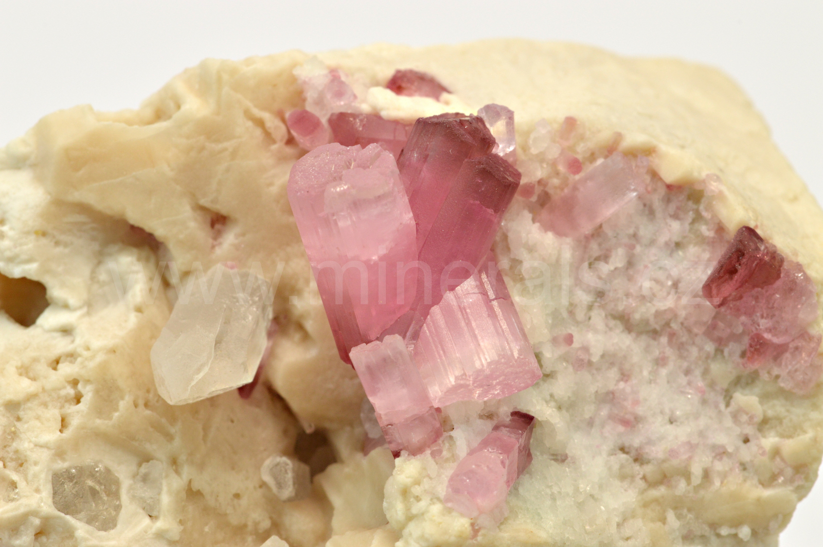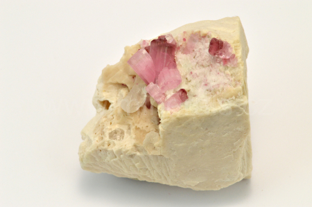 Rubelit vytváří růžové, na koncích krystalů do malinově červena, skelně lesklé, průsvitné, podélně rýhované, sloupcovité, většinou oboustranně ukončené krystaly dosahující velikosti až 12 mm, které se navzájem prorůstají a narůstají na živcovou podložku spolu s drobnými krystaly křemene. Vzorky pocházejí z dubnové akce 2017. lice pěk