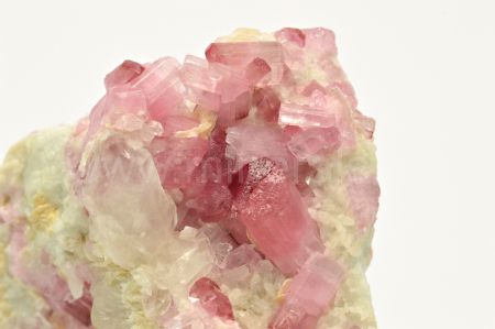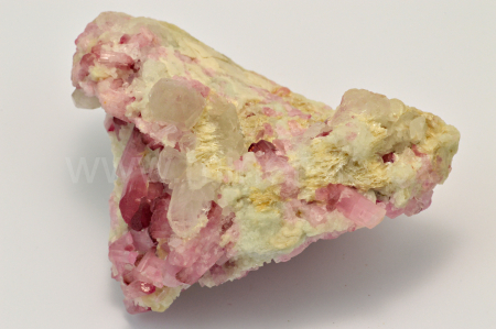 Rubelit vytváří růžové, na koncích krystalů do malinově červena, skelně lesklé, průsvitné, podélně rýhované, sloupcovité, většinou oboustranně ukončené krystaly dosahující velikosti až 10 mm, které se navzájem prorůstají a spolu s drobnými krystaly křišťálu narůstají na živcovou podložku. Vzorky pocházejí z dubnové akce 2017.