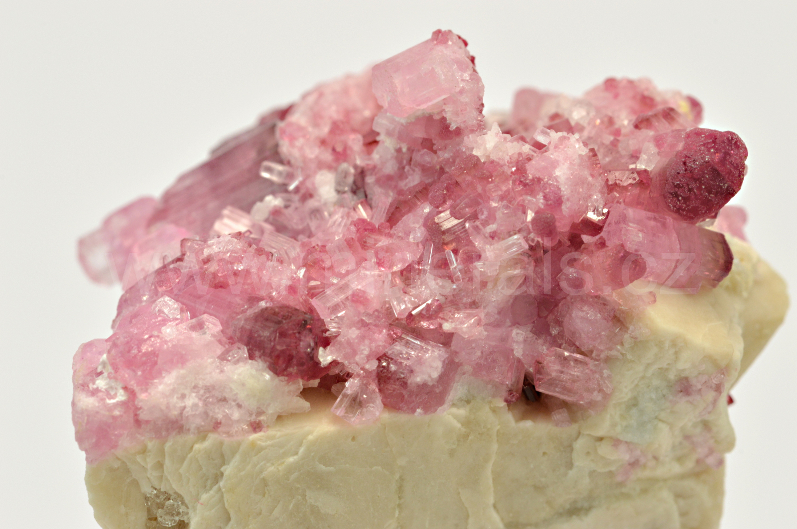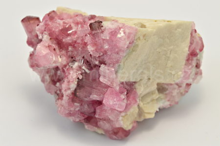 Rubelit vytváří růžové, na koncích krystalů do malinově červena, skelně lesklé, průsvitné, podélně rýhované, sloupcovité, většinou oboustranně ukončené krystaly dosahující velikosti až 10 mm, které se navzájem prorůstají a spolu s drobnými křišťály narůstají na živcovou podložku. Vzorky pocházejí z dubnové akce 2017.