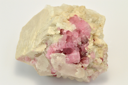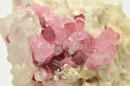 Rubelit vytváří růžové, na koncích krystalů do malinově červena, skelně lesklé, průsvitné, podélně rýhované, sloupcovité, většinou oboustranně ukončené krystaly dosahující velikosti až 10 mm, které se navzájem prorůstají a spolu s krystaly křemene narůstají na živcovou podložku Vzorky pocházejí z dubnové akce 2017.