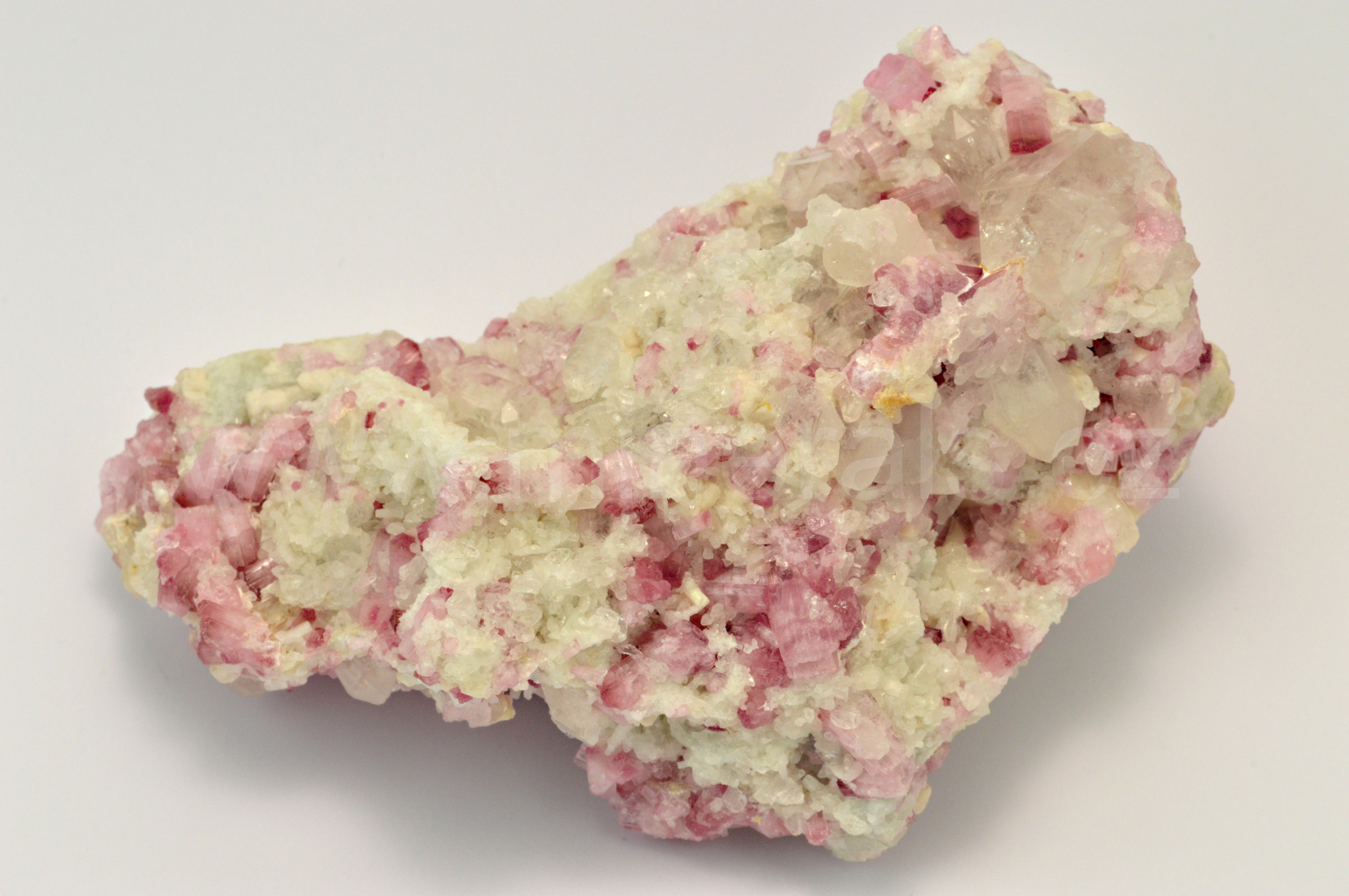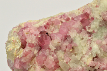 Rubelit vytváří růžové, na koncích krystalů do malinově červena, skelně lesklé, průsvitné, podélně rýhované, sloupcovité, většinou oboustranně ukončené krystaly dosahující velikosti až 9 mm, které se navzájem prorůstají a spolu s krystaly křemene narůstají na živcovou podložku. Oboustranný vzorek. Vzorky pocházejí z dubnové akce 2017.
