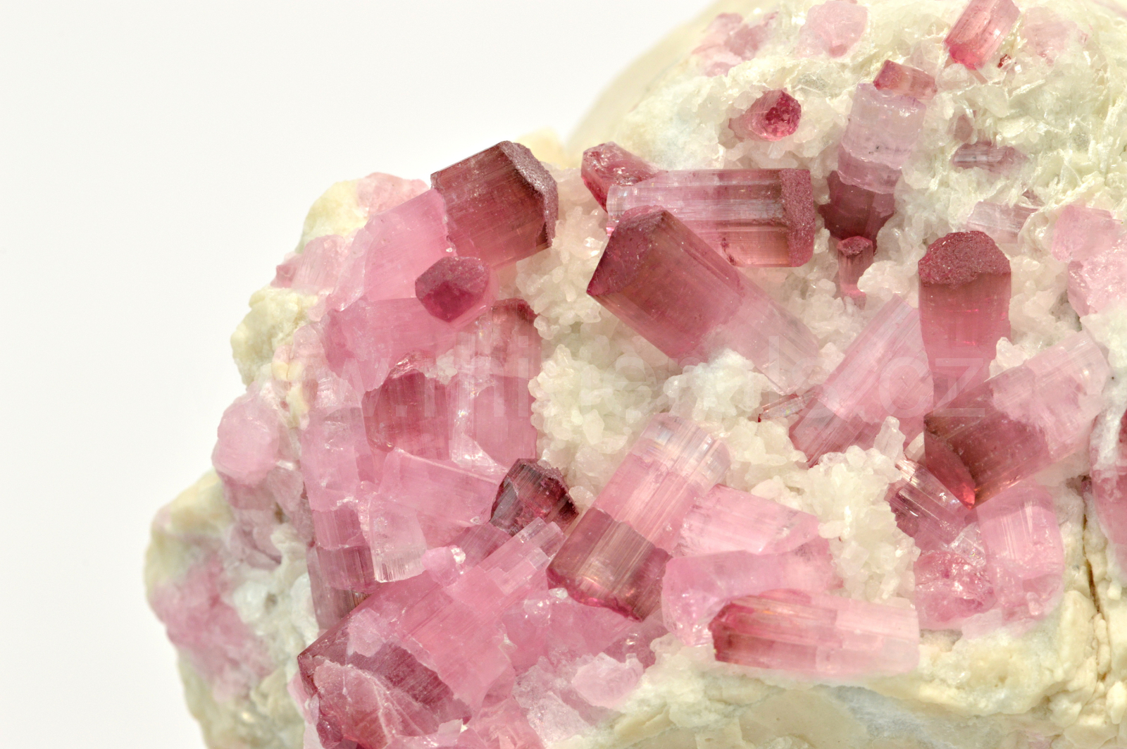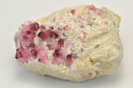 Rubelit vytváří růžové, na koncích krystalů do malinově červena, skelně lesklé, průsvitné, podélně rýhované, sloupcovité, většinou oboustranně ukončené krystaly dosahující velikosti až 11 mm, které se navzájem prorůstají a spolu s krystaly křemene narůstají na živcovou podložku. Velmi kvalitní vzorek, kde krystaly mají vynikající lesk. Vzorky pocházejí z dubnové akce 2017.