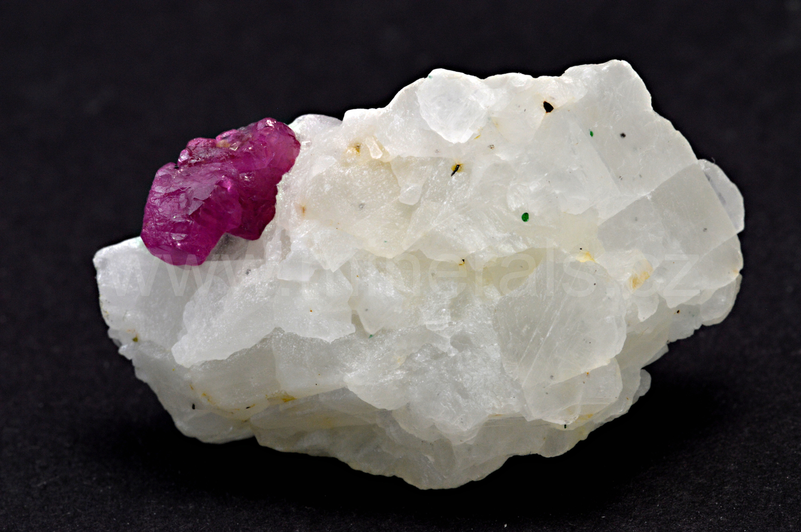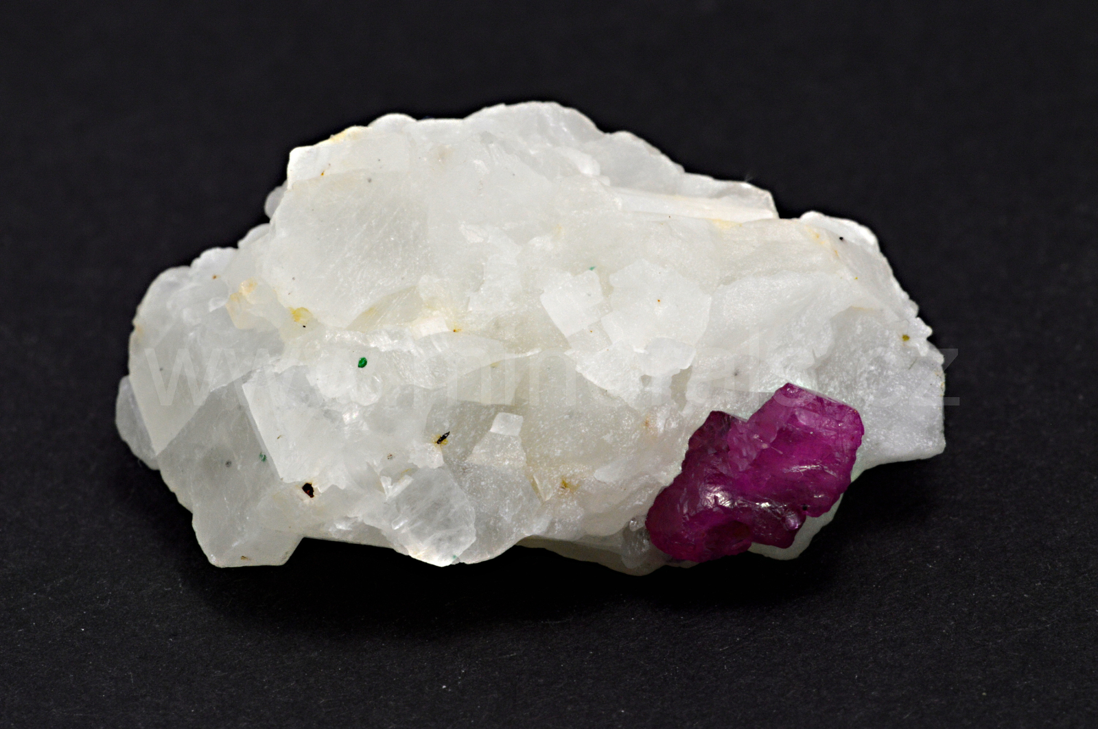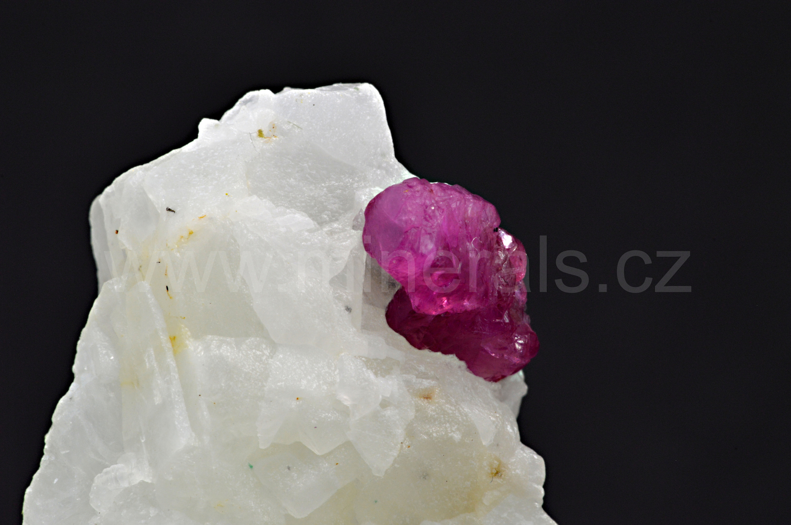 Rubín vytváří červenofialové, skelně lesklé, průsvitné, soudečkovité krystaly dosahující velikosti až 4 mm, které se navzájem prorůstají a zarůstají do mléčně bílého hrubě zrnitého mramoru. Rubín svítí velice intenzivně pod UV lampou.
