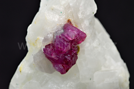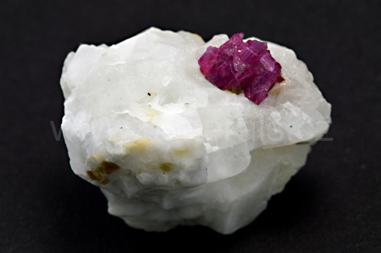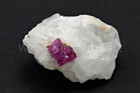 Rubín vytváří červenofialové, skelně lesklé, průsvitné, soudečkovité krystaly dosahující velikosti až 4 mm, které se navzájem prorůstají a zarůstají do mléčně bílého hrubě zrnitého mramoru. Rubín svítí velice intenzivně pod UV lampou.