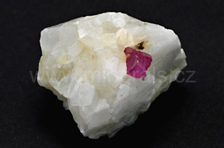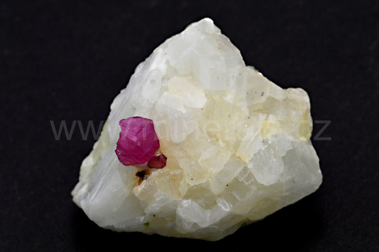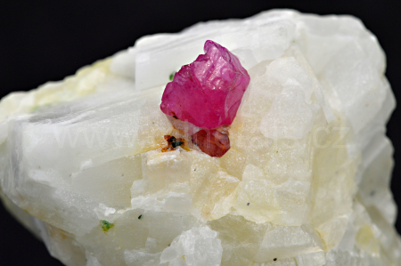 Rubín vytváří červenofialový, skelně lesklý, průsvitný, soudečkovitý, oboustranně ukončený krystal dosahující velikosti cca 5 mm, který zarůstá do mléčně bílého hrubě zrnitého mramoru. Rubín svítí velice intenzivně pod UV lampou.
