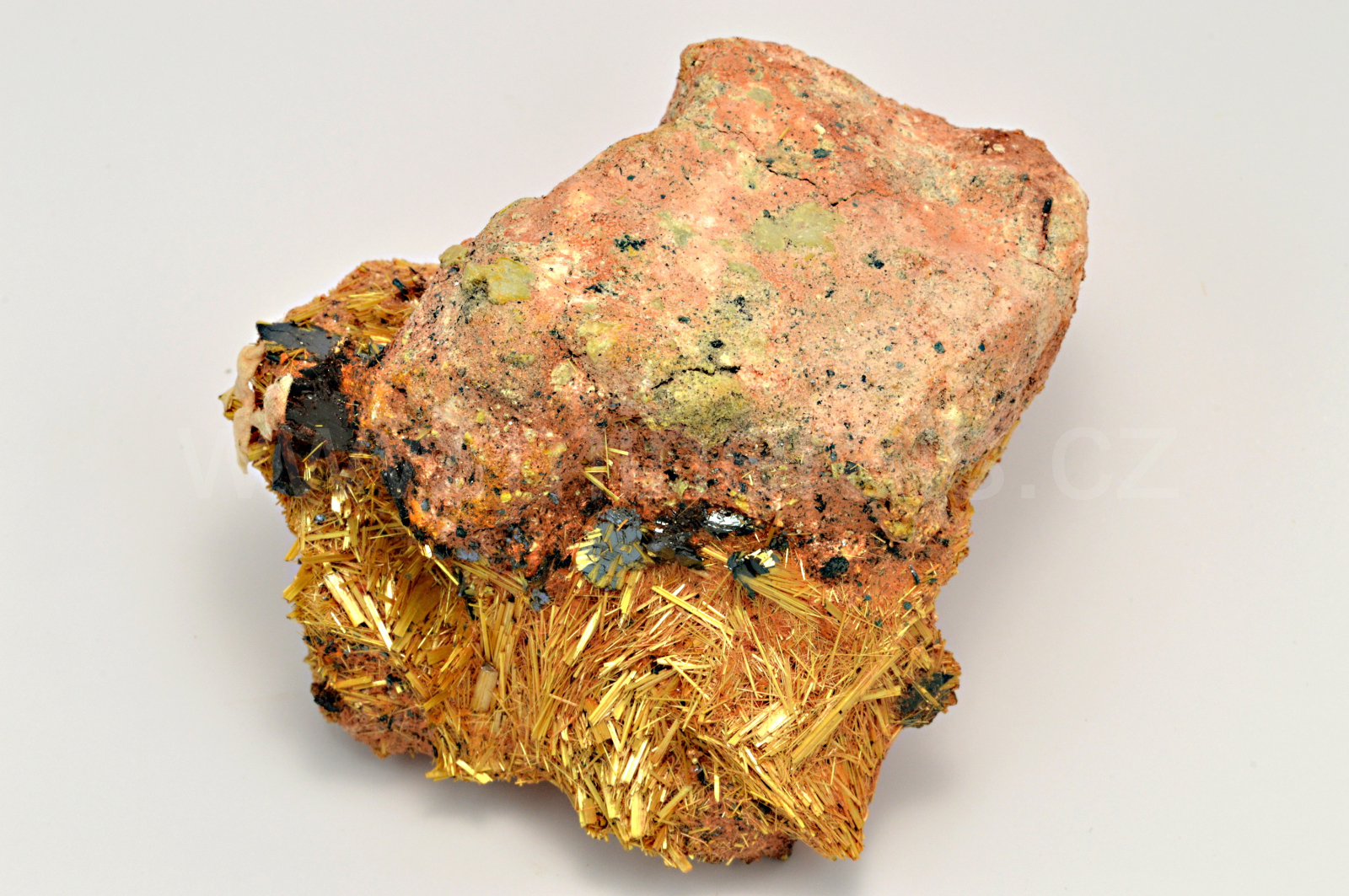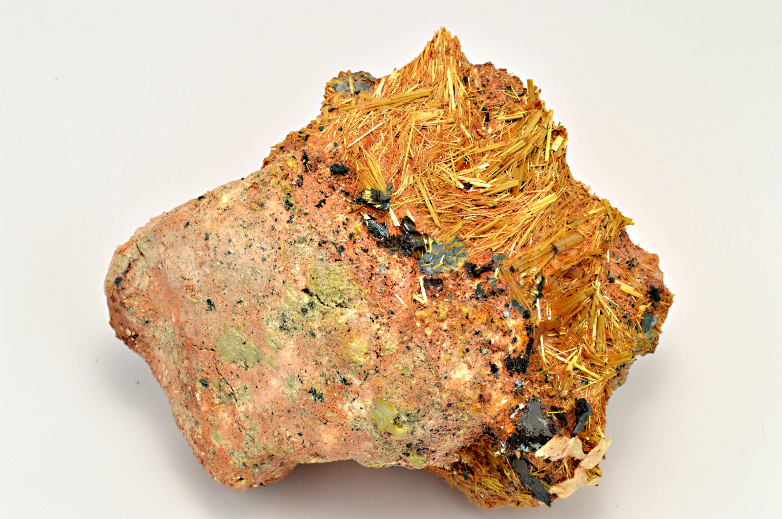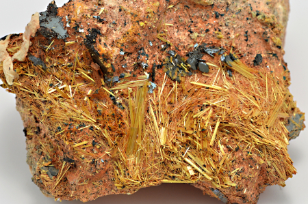 Rutil vytváří slámově žluté, zlatavé, lehce naoranžovělé, polokovově až kovově lesklé, neprůsvitné, jehlicovité krystaly dosahující délky až 15 mm, které se navzájem prorůstají a doprovází je šedé, kovově lesklé, neprůsvitné hematity. Celý vzorek byl odborně stabilizován těžařem v Brazílii přímo při dobývání, aby ho bylo možno bez poškození vyjmout. Tato stabilizace je úplně neznatelná. POZOR! Jehlice rutilu se velice rády zapíchávají do prstů.....