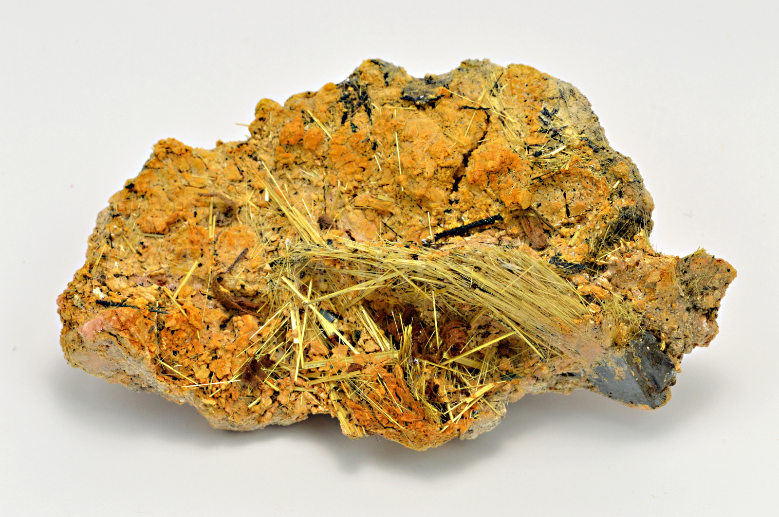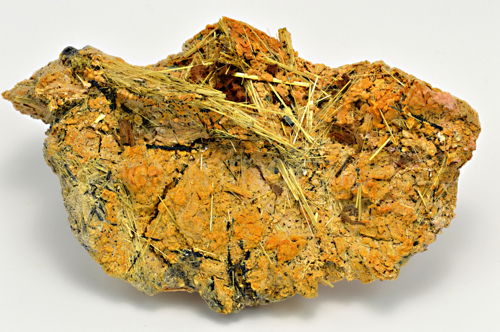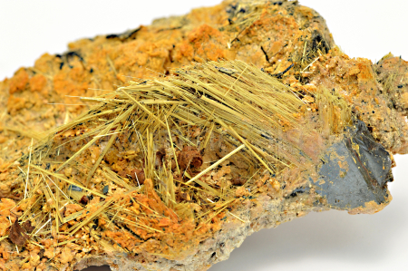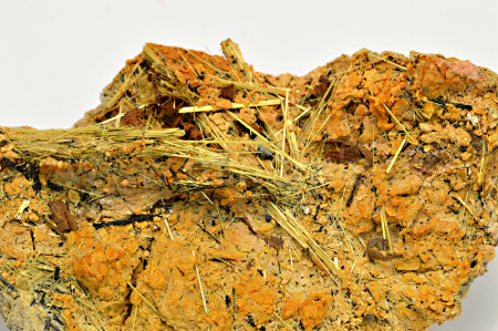Rutil vytváří slámově žluté, zlatavé, lehce naoranžovělé, polokovově až kovově lesklé, neprůsvitné, jehlicovité krystaly dosahující délky až 20 mm, které se navzájem prorůstají. Celý vzorek byl odborně stabilizován těžařem v Brazílii přímo při dobývání, aby ho bylo možno bez poškození vyjmout. Tato stabilizace je úplně neznatelná. POZOR! Jehlice rutilu se velice rády zapíchávají do prstů.....