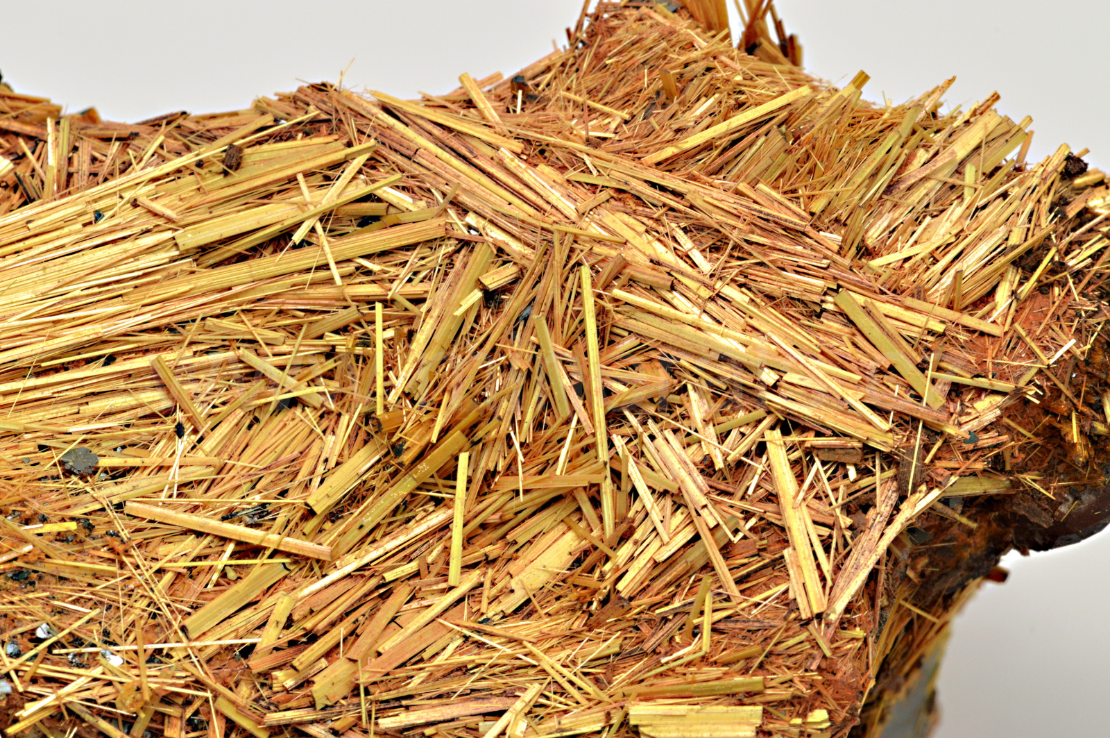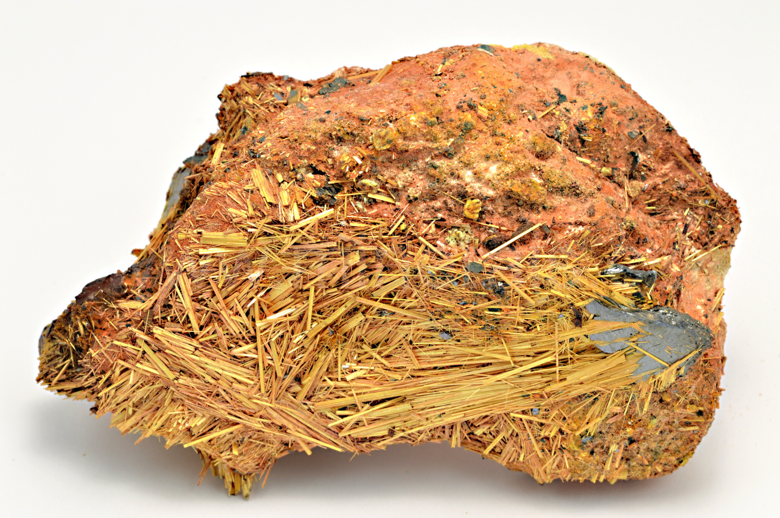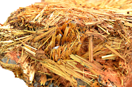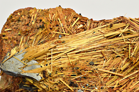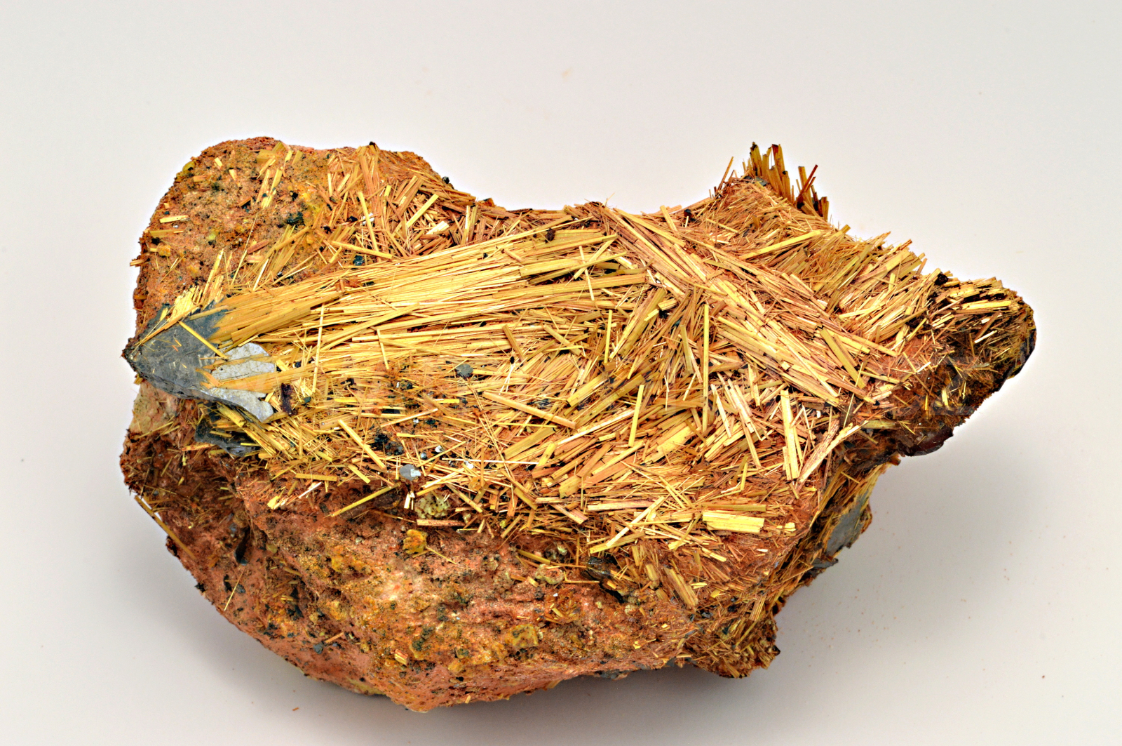 Rutil vytváří slámově žluté, zlatavé, lehce naoranžovělé, polokovově až kovově lesklé, neprůsvitné, jehlicovité krystaly dosahující délky až 40 mm, které se navzájem prorůstají a pokrývají celou horní plochu vzorku. Celý vzorek byl odborně stabilizován těžařem v Brazílii přímo při dobývání, aby ho bylo možno bez poškození vyjmout. Tato stabilizace je úplně neznatelná. POZOR! Jehlice rutilu se velice rády zapíchávají do prstů.....Velmi kvalitní vzorek.