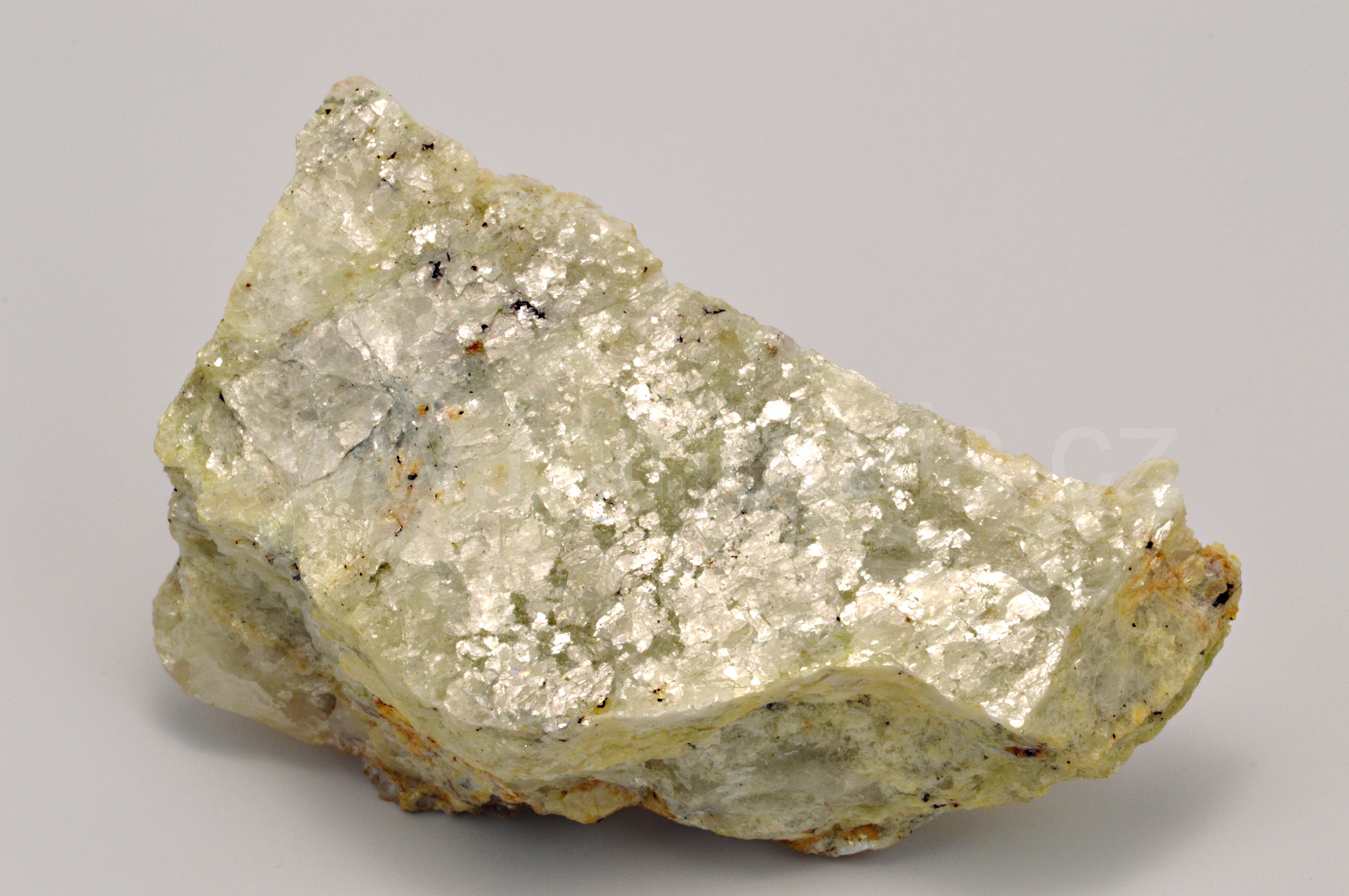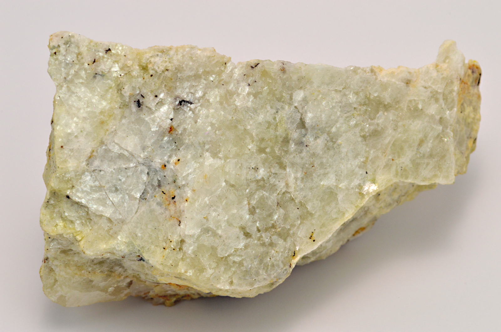 Sanbornit vytváří bezbarvé až mléčně bílé se zeleným nádechem, perleťově až skelně lesklé, průsvitné, lístkovité a tabulkovité agregáty prorůstají celým vzorkem. Velmi kvalitní vzorek.