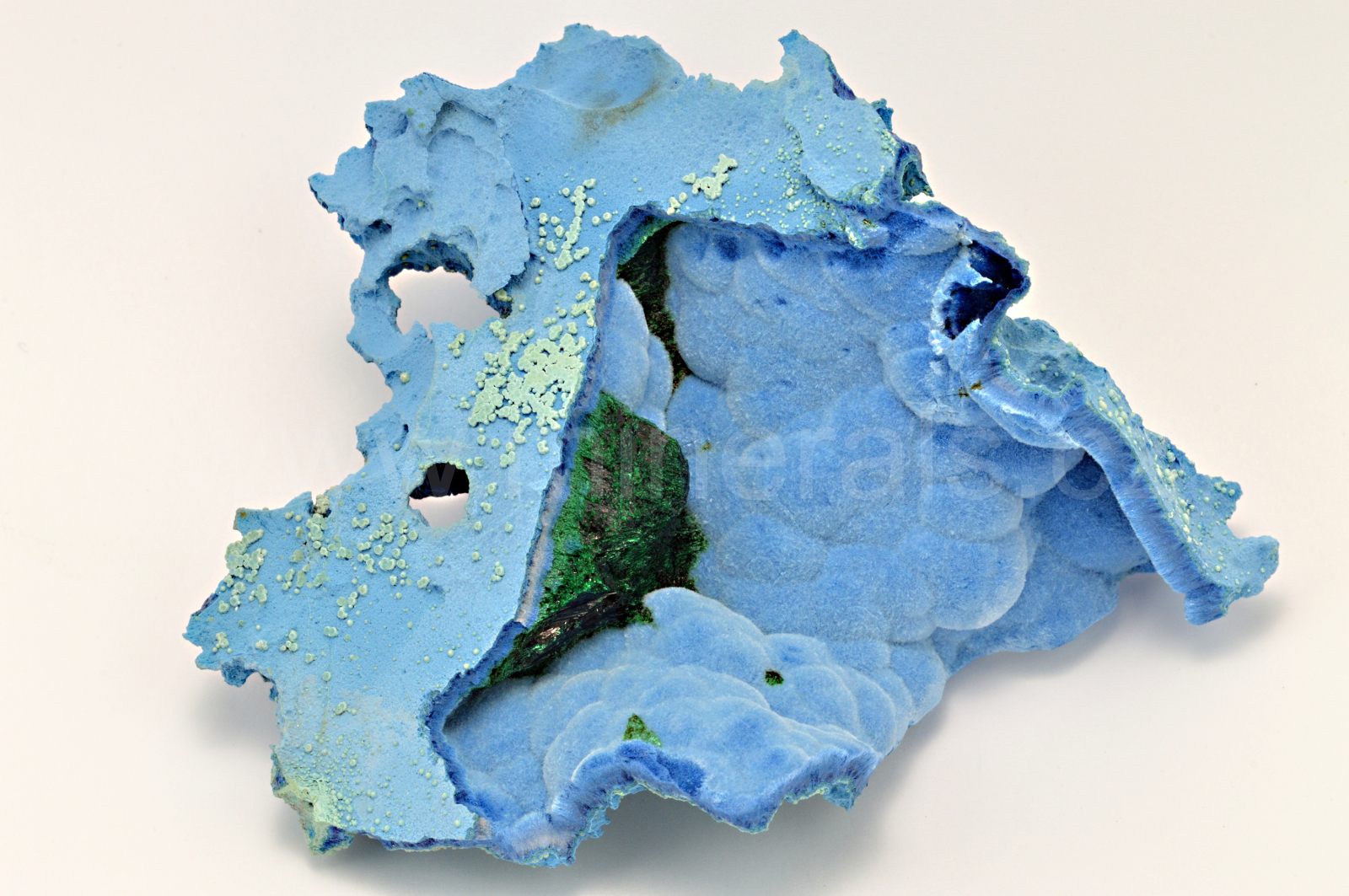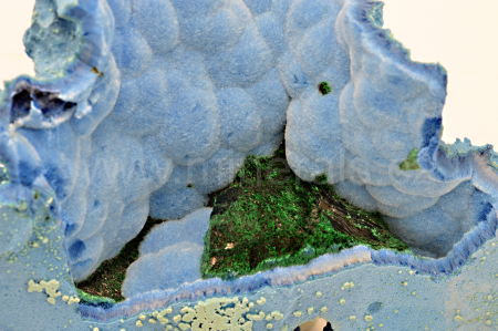 Shattuckit vytváří nebesky modré a tmavě modré, hedvábně lesklé, částečně průsvitné, ledvinité a radiálně paprsčité agregáty složené z jehlicovitých krystalů dosahující délky až 3 mm, které se navzájem prorůstají a na které uprostřed vzorků narůstá srostlice tmavě zelených, skelně lesklých krystalů malachitu. Velmi pěkná kombinace.