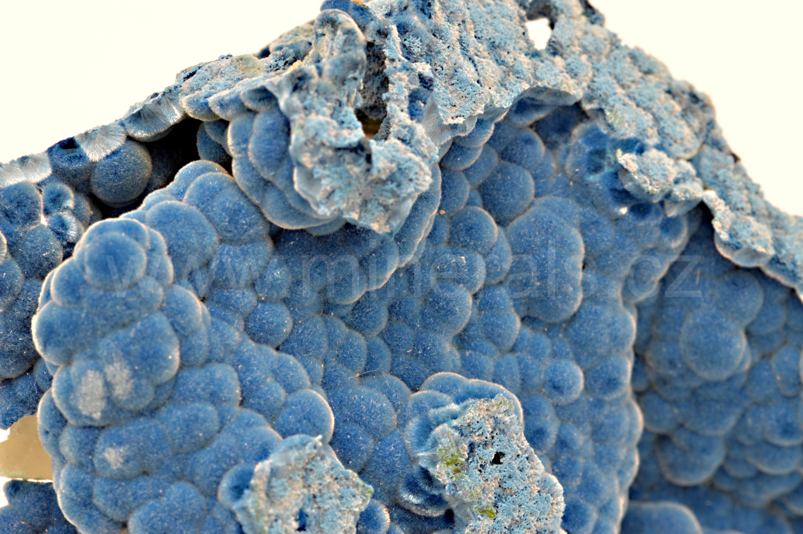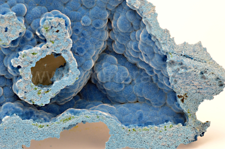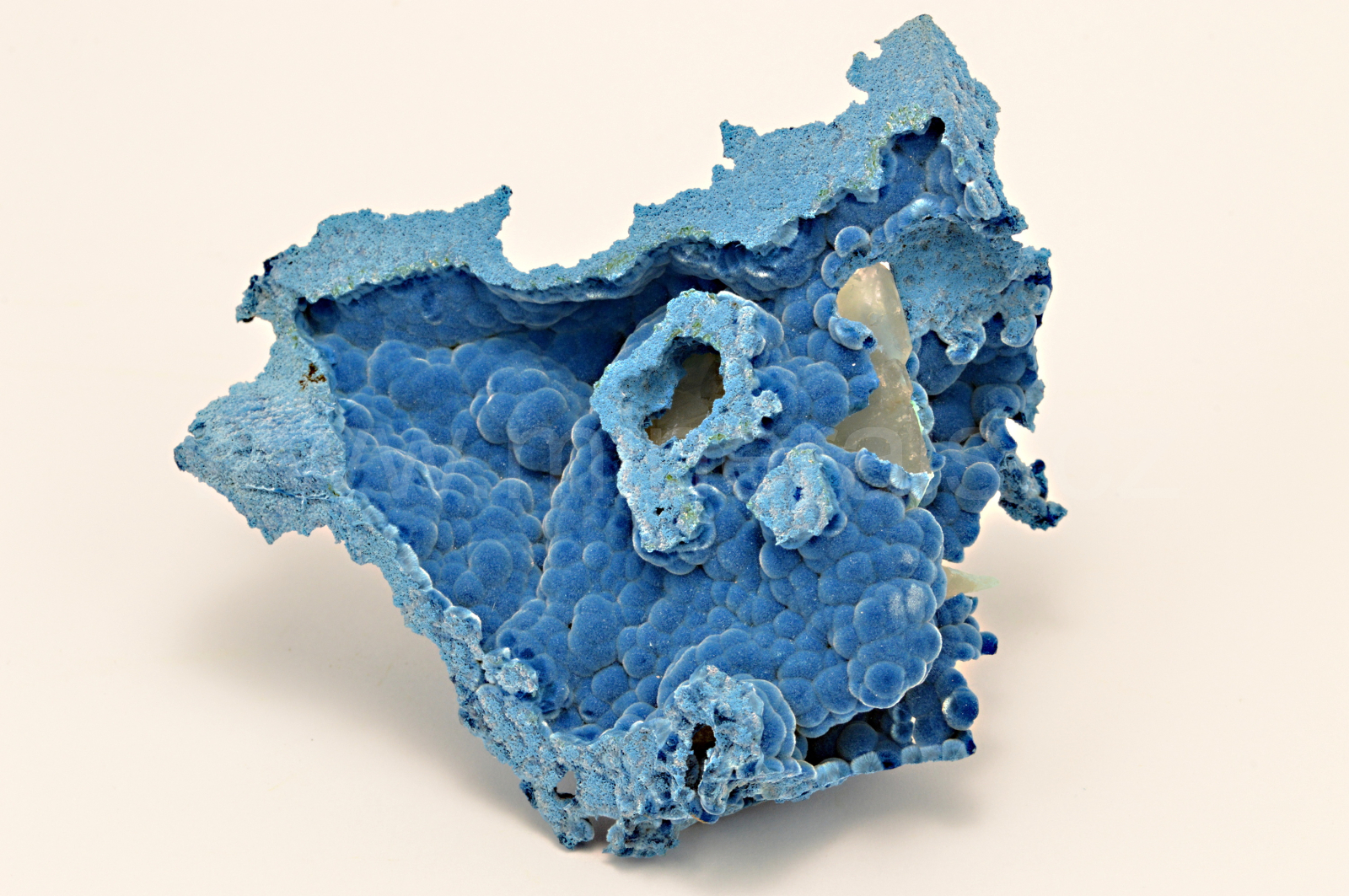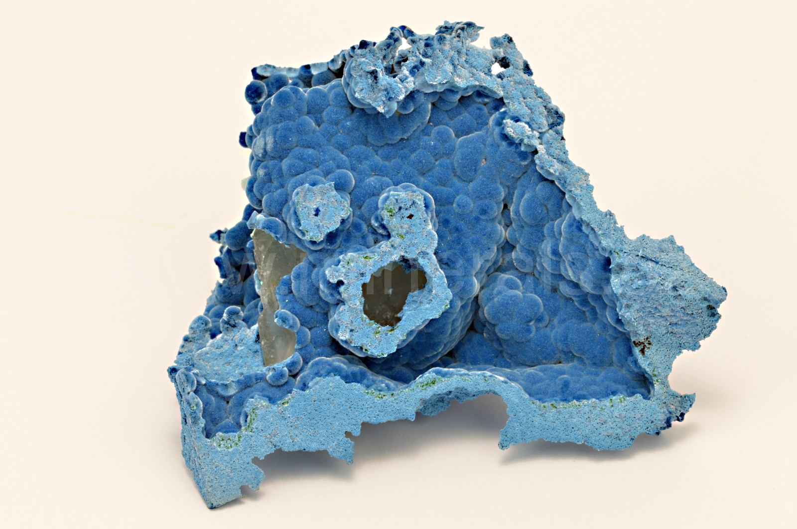 Shattuckit vytváří nebesky modré a tmavě modré, hedvábně lesklé, částečně průsvitné, ledvinité a radiálně paprsčité agregáty složené z jehlicovitých krystalů dosahující délky až 3 mm, které se navzájem prorůstají a tvoří polokulovité agregáty a kůry. Doporučuji, nedotýkat se hedvábných částí. Zajímavostí tohoto vzorku jsou uzavřené a obrostlé krystaly kalcitu, které nemohou vypadnout a při zatřepání "chrastí".