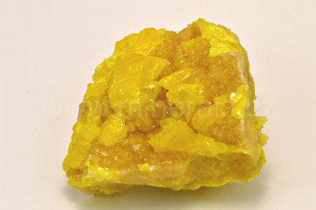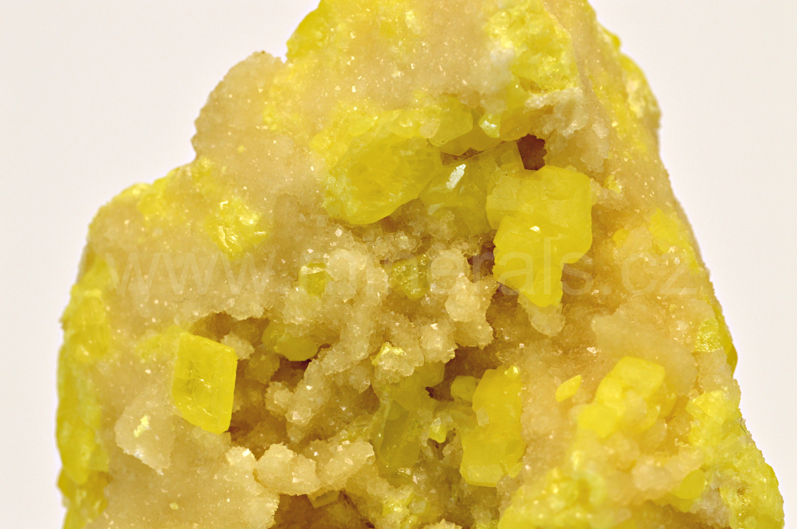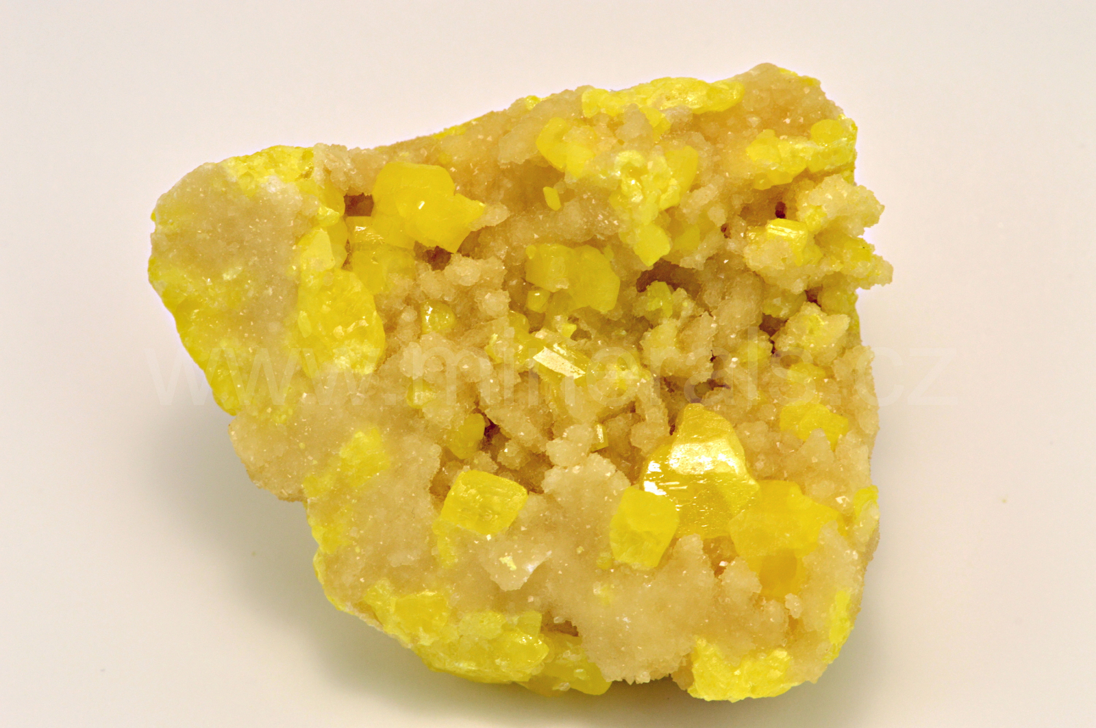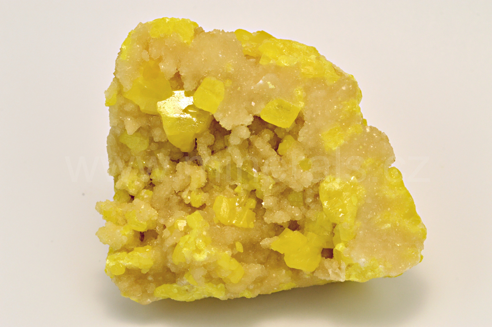 Síra vytváří sytě žluté, skelně až diamantově lesklé, průsvitné, pěkně ohraničené krystaly dosahující velikosti až 13 mm, které se navzájem prorůstají. Oboustranný vzorek. Vzorky síry z této lokality mají výhodu, že "nečpí" jako ostatní vzorky.