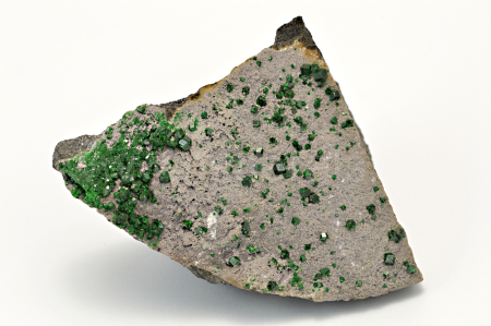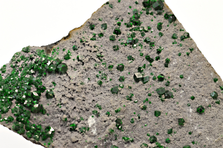 Uvarovit vytváří temně smaragdově zelené, částečně průsvitné, skelně až diamantově lesklé, dokonale ohraničené krystaly ve velikosti až 2 mm, které zarůstají do narůžověleho chloritu - penantitu. Šedočernou podložku tvoří hrubě zrnitý chromit.