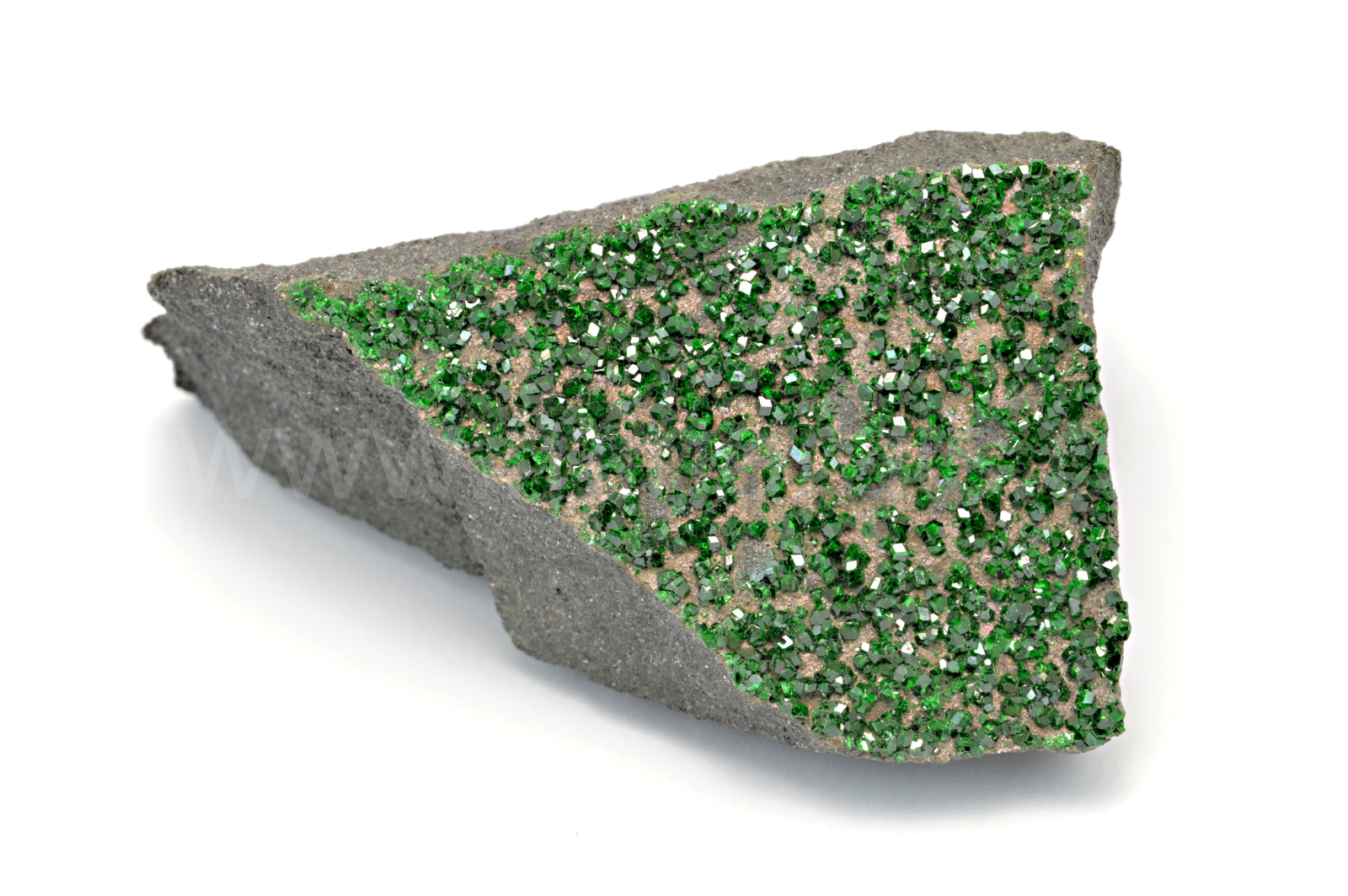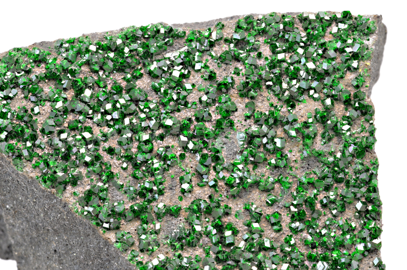 Uvarovit vytváří temně smaragdově zelené, částečně průsvitné, skelně až diamantově lesklé, dokonale ohraničené krystaly ve velikosti až 2 mm které se navzájem prorůstají. Šedočernou podložku tvoří hrubě zrnitý chromit.