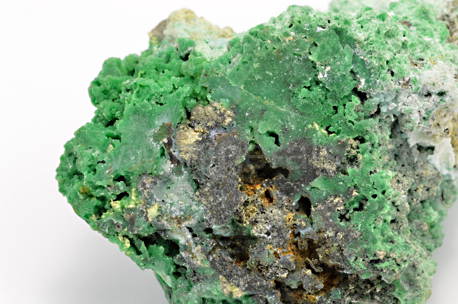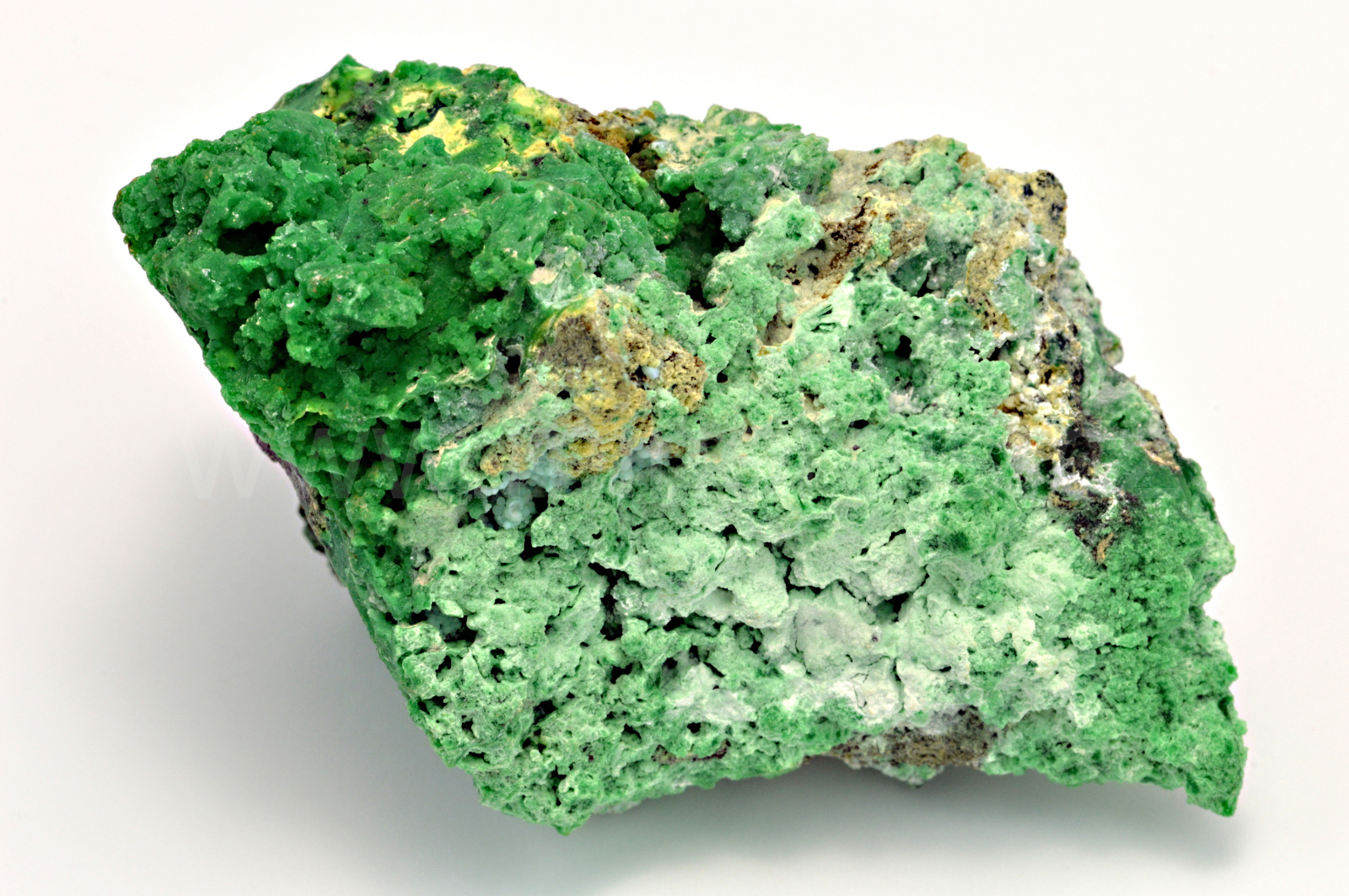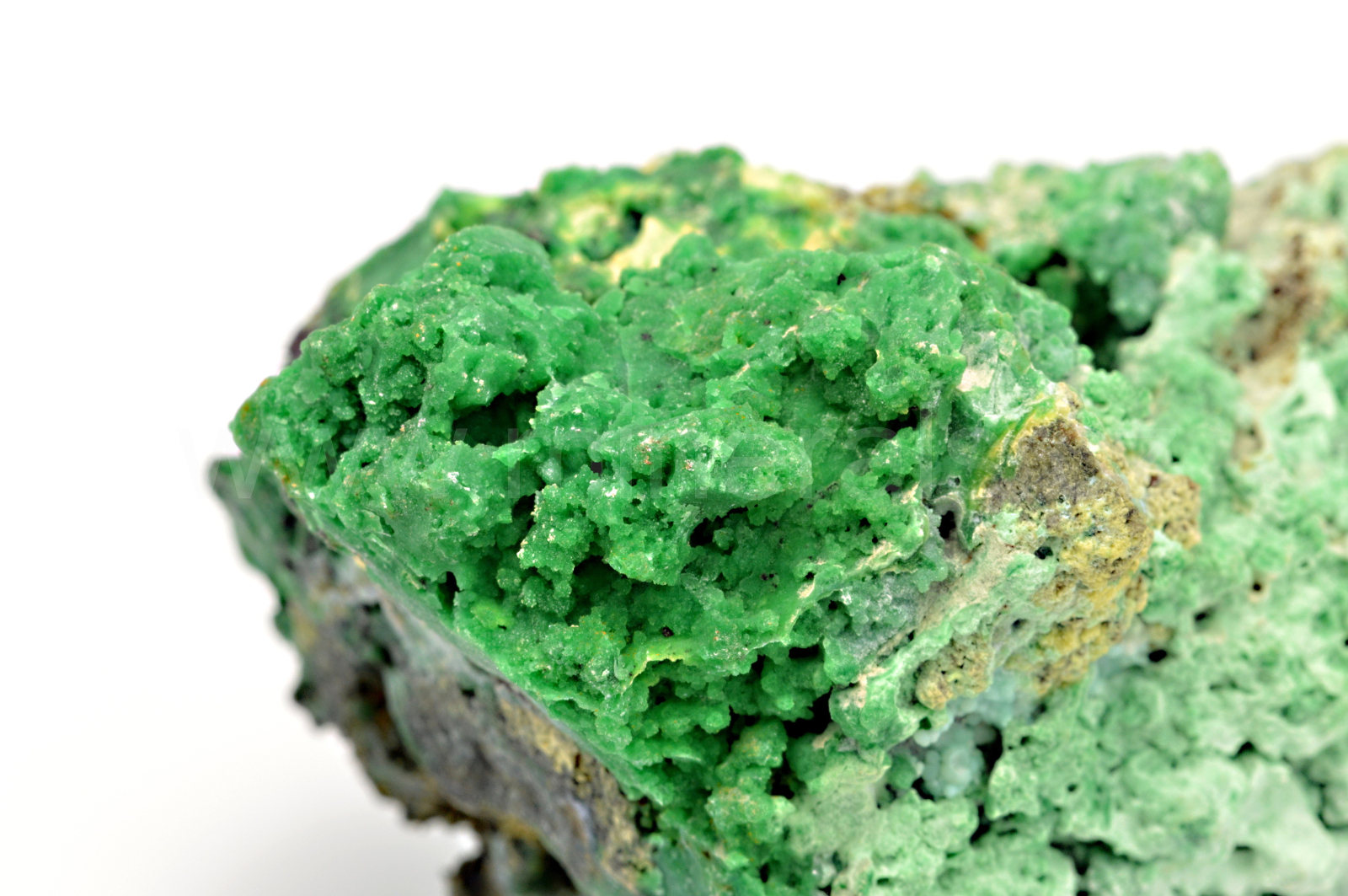 Variscit vytváří temně trávově zelené, matně až skelně lesklé, částečně průsvitné, masivní a bradavičnaté agregáty, které tvoří skoro celý vzorek.