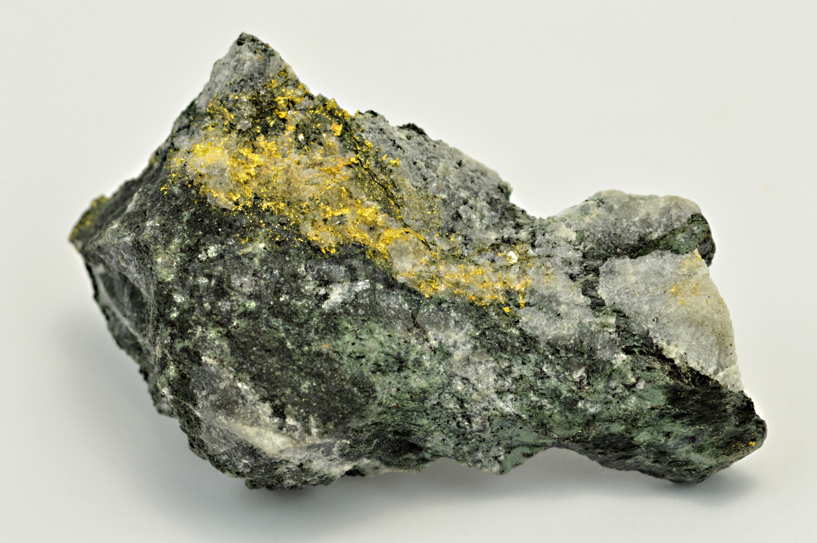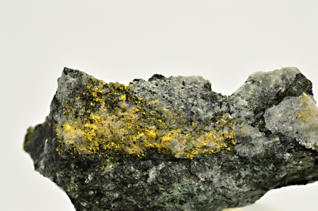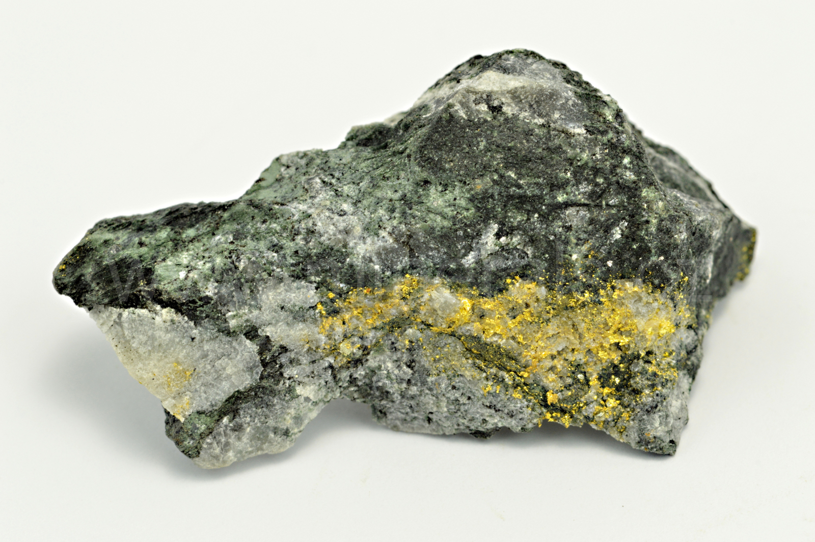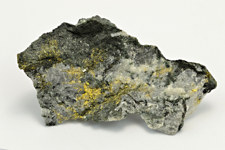 Zlato vytváří zlatavě žluté, kovově lesklé, neprůsvitné, plíškovité a dendritické agregáty, které zarůstají do mléčně bílého křemene spolu s jemně zrnitým sfaleritem a zlatavým pyritem. Oboustranný vzorek.